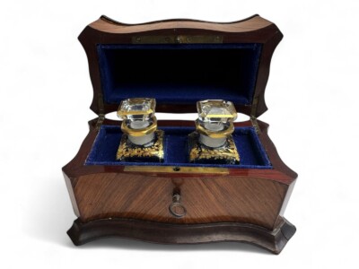 Exquisite French Pair of Crystal & Gilded Perfumes in Fitted Walnut Box with Hinged Lid, late 19th Century