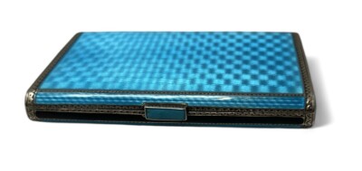 Gorgeous and Unusual European Circa 1900 Guilloché Enamel Card Case/Snuff Box in Cyan Blue with .900 Gilt Silver Interior, Black Enamel & Silver Trim