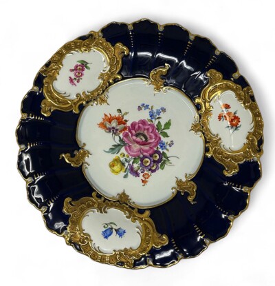 Luxurious Meissen Hand Painted Floral Porcelain Plate with Deep Cobalt Blue & Rich Gold Gilding, 19th Century