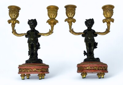 French Napoleon III Period – Child Faun/Satyr – Candelabras in Stunning Detail of Bronze and Marble, Circa 1850