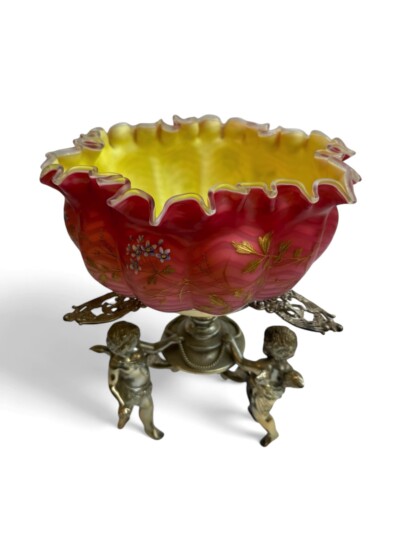 Victorian Satin Glass Center Bowl or “Bride’s Basket” with Cherub Stand by American Wilcox Silver Plate Co., Meriden Connecticut Circa 1870-1880
