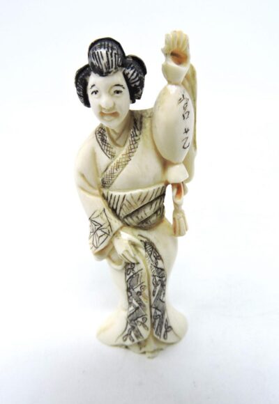 Signed, Hand Carved Asian Netsuke of Japanese Woman in a Kimono, Holding a Scroll with her Left Hand