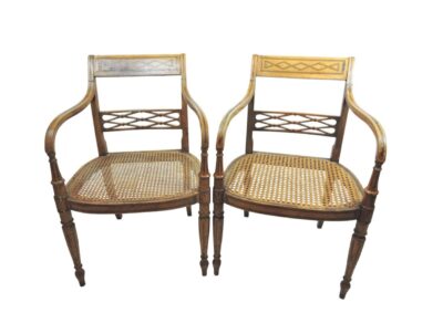 Pair of Inlaid Wood Arm Chairs with Caned Seats, Tapered Legs