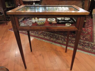 Mahogany and Banded Inlaid Satinwood and Glass Showcase / Display Stand on 4 Legs, Red Velvet Interior – c.1900