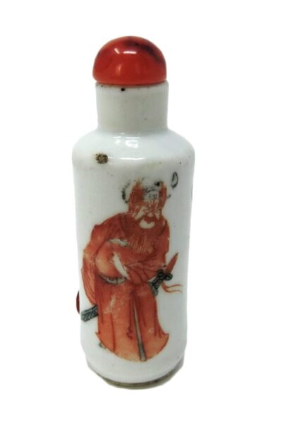 Chinese Painted Porcelain Snuff Bottle with Wooden Stopper & Bone Spoon