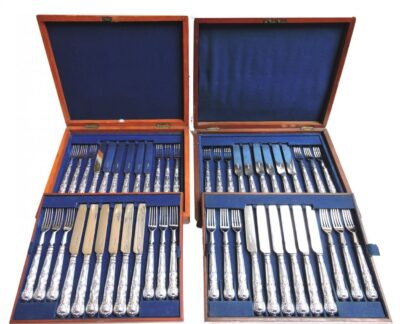 Kings Pattern Silver-Plated Fruit Knives and Forks (Set for 24) in Two Double Layer Felt-Lined Wooden Canteens