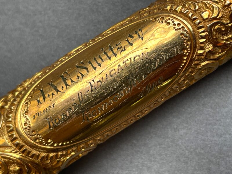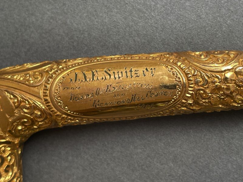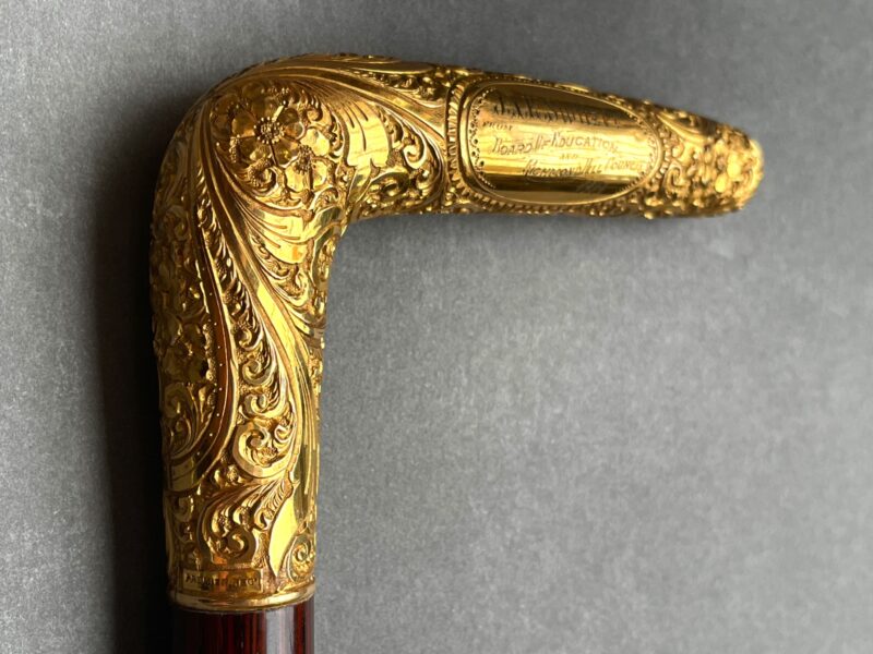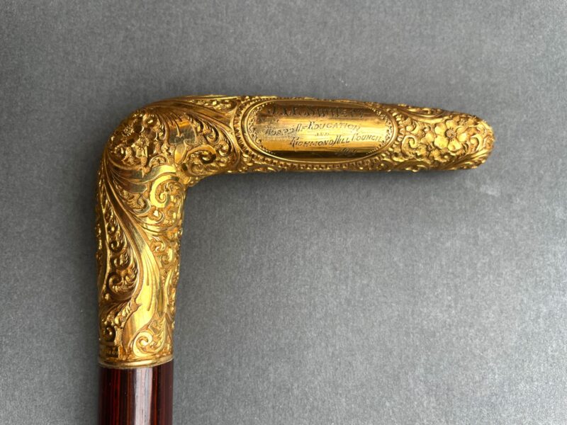 A sturdy and handsome English walking stick / cane with a bright 10 karat gold handle with repoussé decoration & engraving as well as an  engraved presentation for “JAE Switzer – from Board of Education & Richmond Hill Council – 1909″