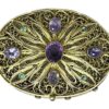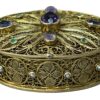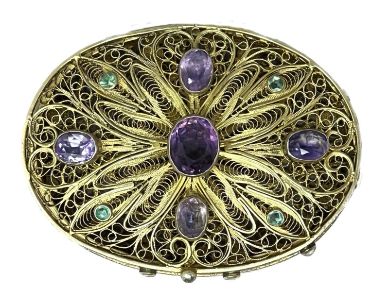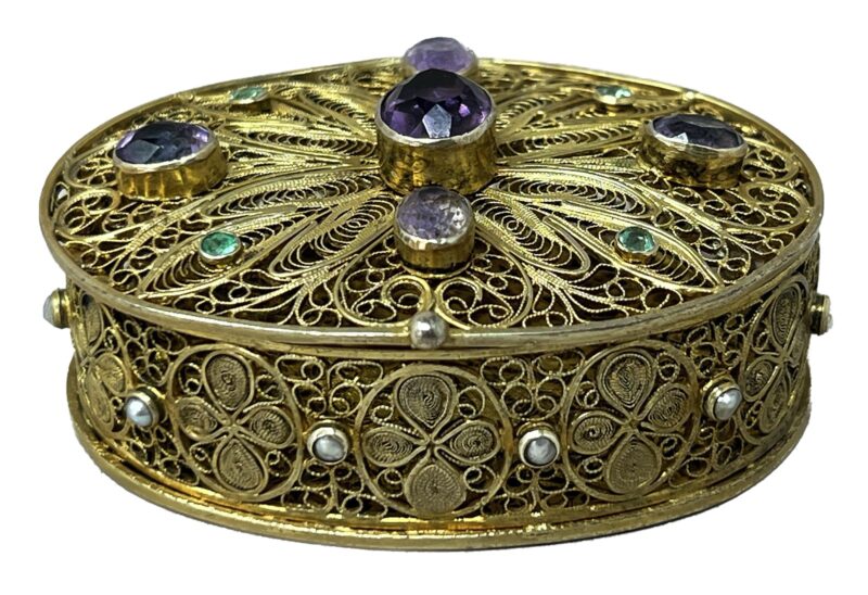 v** SOLD ARCHIVES **v11 karat gold “Pomander” box circa late 19th -early 20th century was historically used to carry “herbalist fragrant mixtures”. Hand crafted and assembled in the “flower and leaf” fashion, with layered filigree wound and fused in an intricate pattern. The box is set with eleven natural pearls and complete with “hinge” assembly, “snap clip” closure. The lid is in a “Bezel” fashion setting with 5 oval purple and 4 smaller green coloured glass stones . The hand finishing is perfect and adds to the luxury of this remarkable piece of filigree craftsmanship history. Appraisal is available.