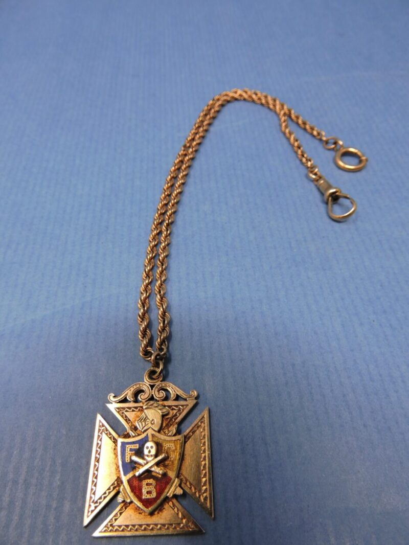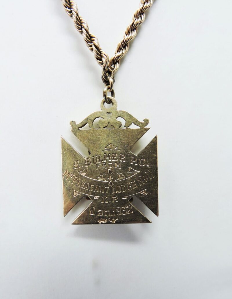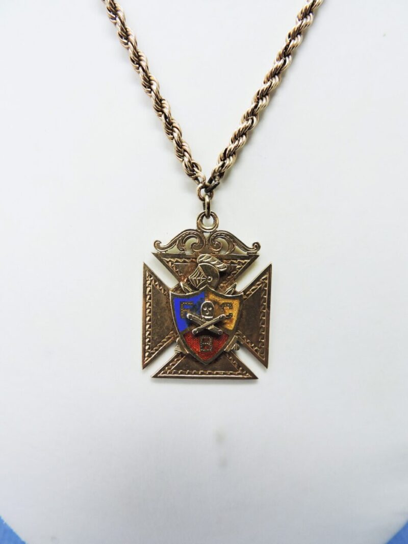 v** SOLD ARCHIVES **vA lovely 14 K gold cross from the Knights of Pythias order, along with a 10K yellow gold watch rope chain attached .
