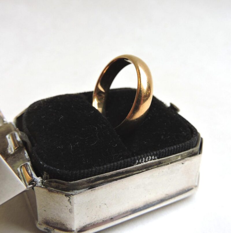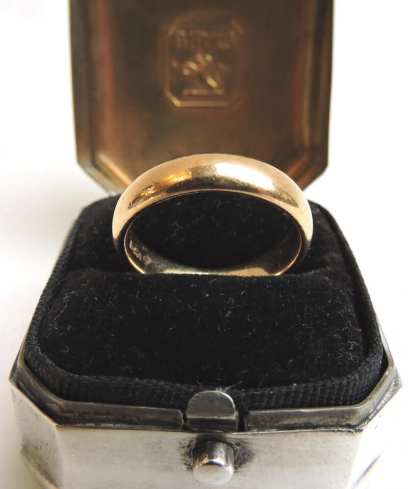 An 18 karat yellow gold wedding band.