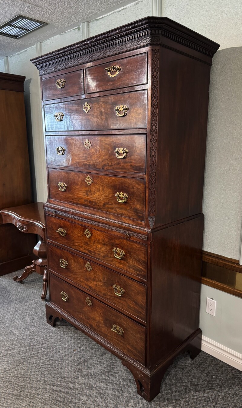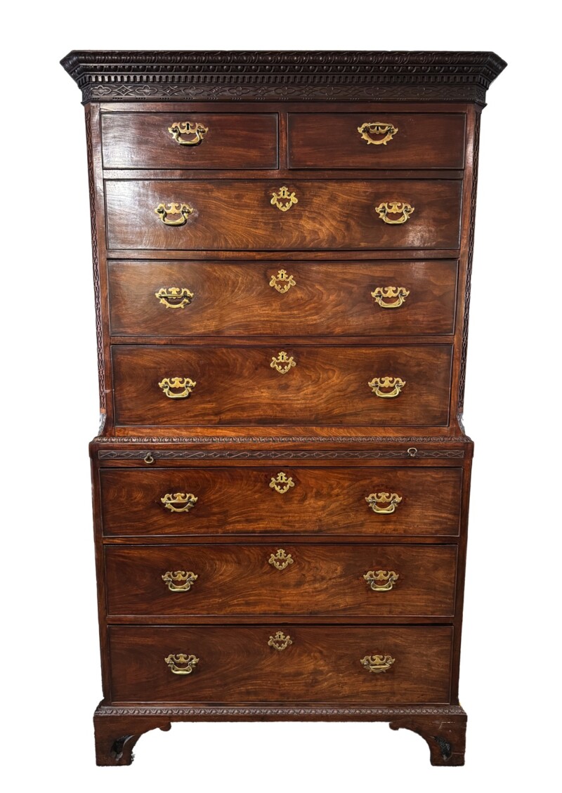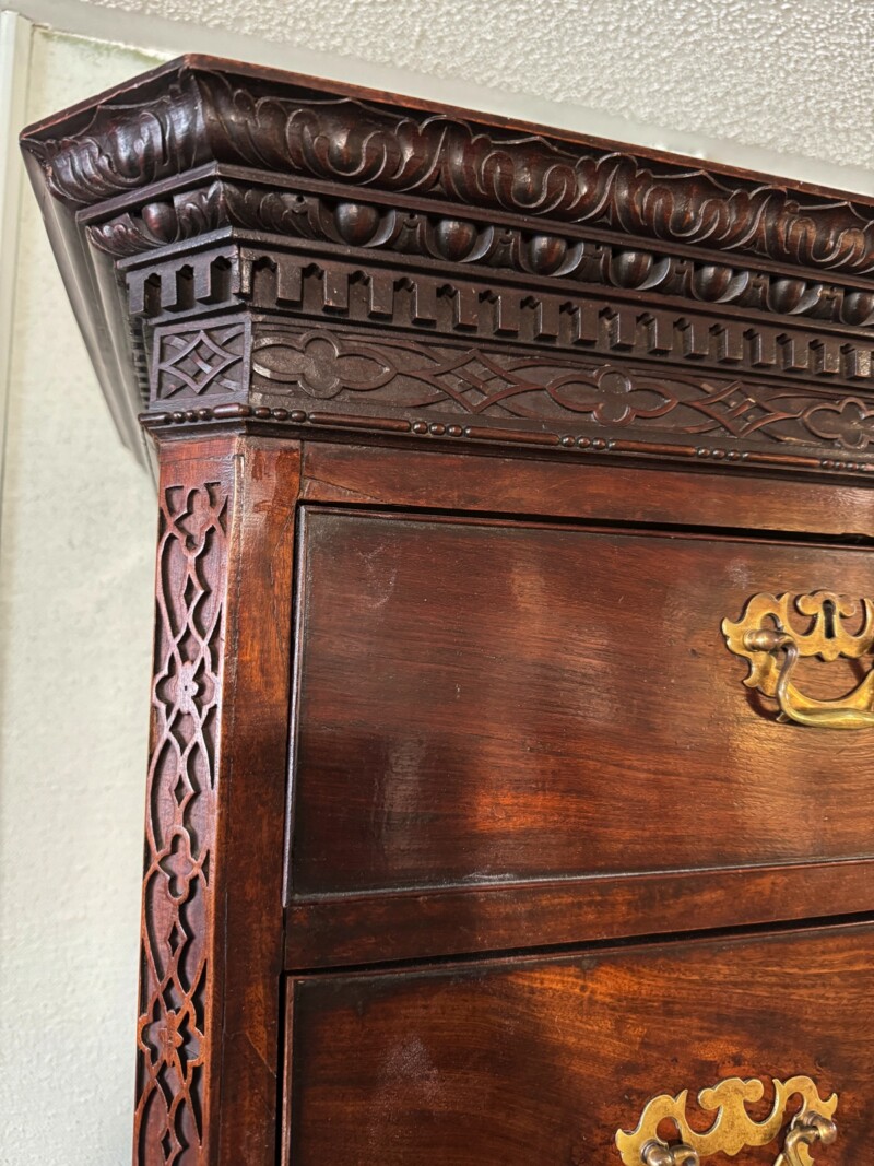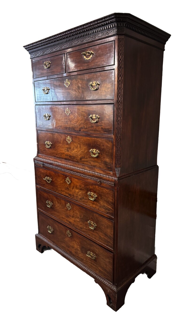 A beautiful quality George III period Chippendale chest on chest (highboy) with intricate hand carved decoration.  The chest has 8 drawers of varying sizes as well as a pull out folding shelf.  The chest sits on pierced and carved tall Georgian bracket feet and each drawer has brass pulls and brass key escutcheons.  The hand carving is decorated in the typical Chippendale style.