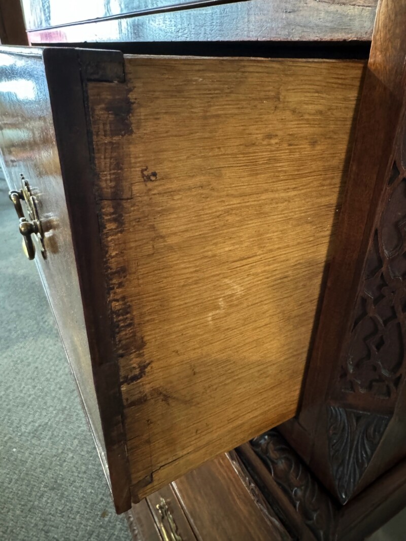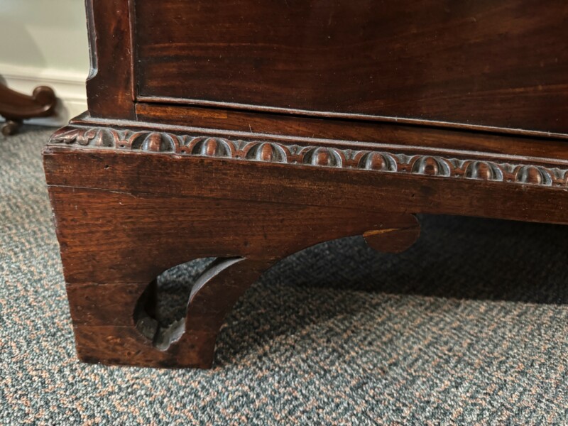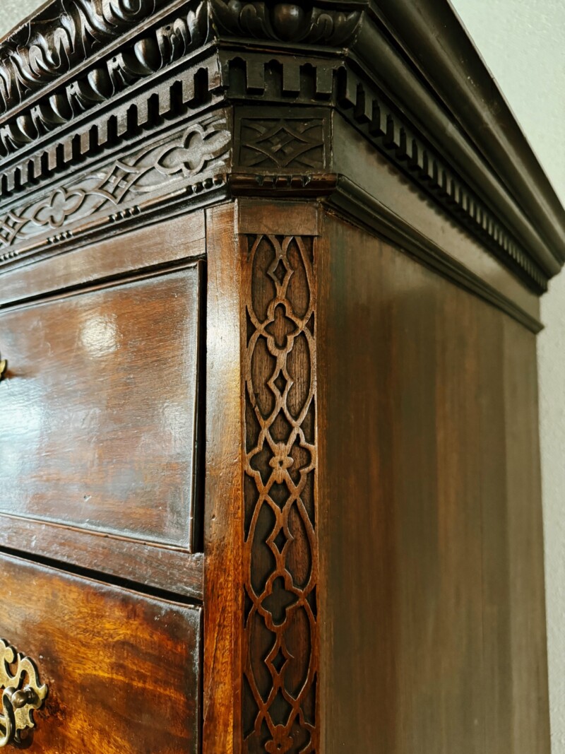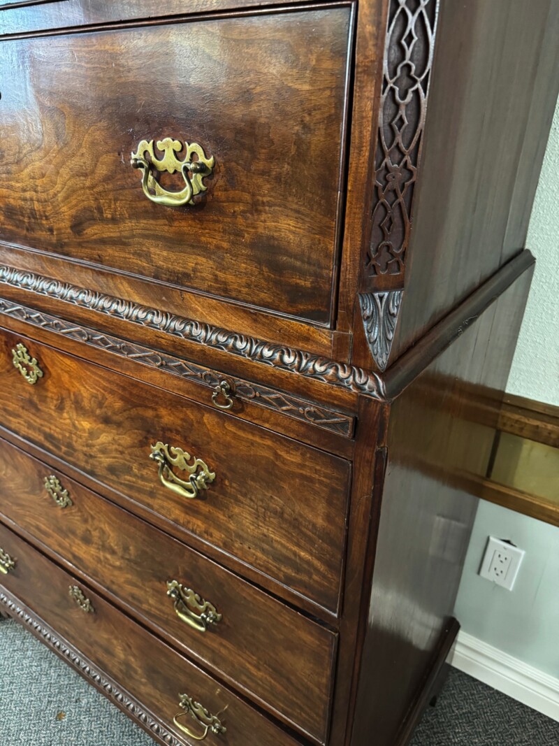 A beautiful quality George III period Chippendale chest on chest (highboy) with intricate hand carved decoration.  The chest has 8 drawers of varying sizes as well as a pull out folding shelf.  The chest sits on pierced and carved tall Georgian bracket feet and each drawer has brass pulls and brass key escutcheons.  The hand carving is decorated in the typical Chippendale style.