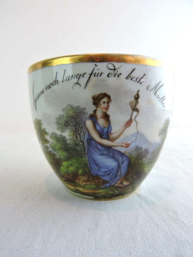 The hand painted scene is of a woman in a landscape with a flowing blue dress. She holds a a stick with long hair attached and a lock twirling down. A saying is written above the scene: “Spinner noch Lange sure die best Mutter” – loosely translated “Spider still long for the best Mother”..