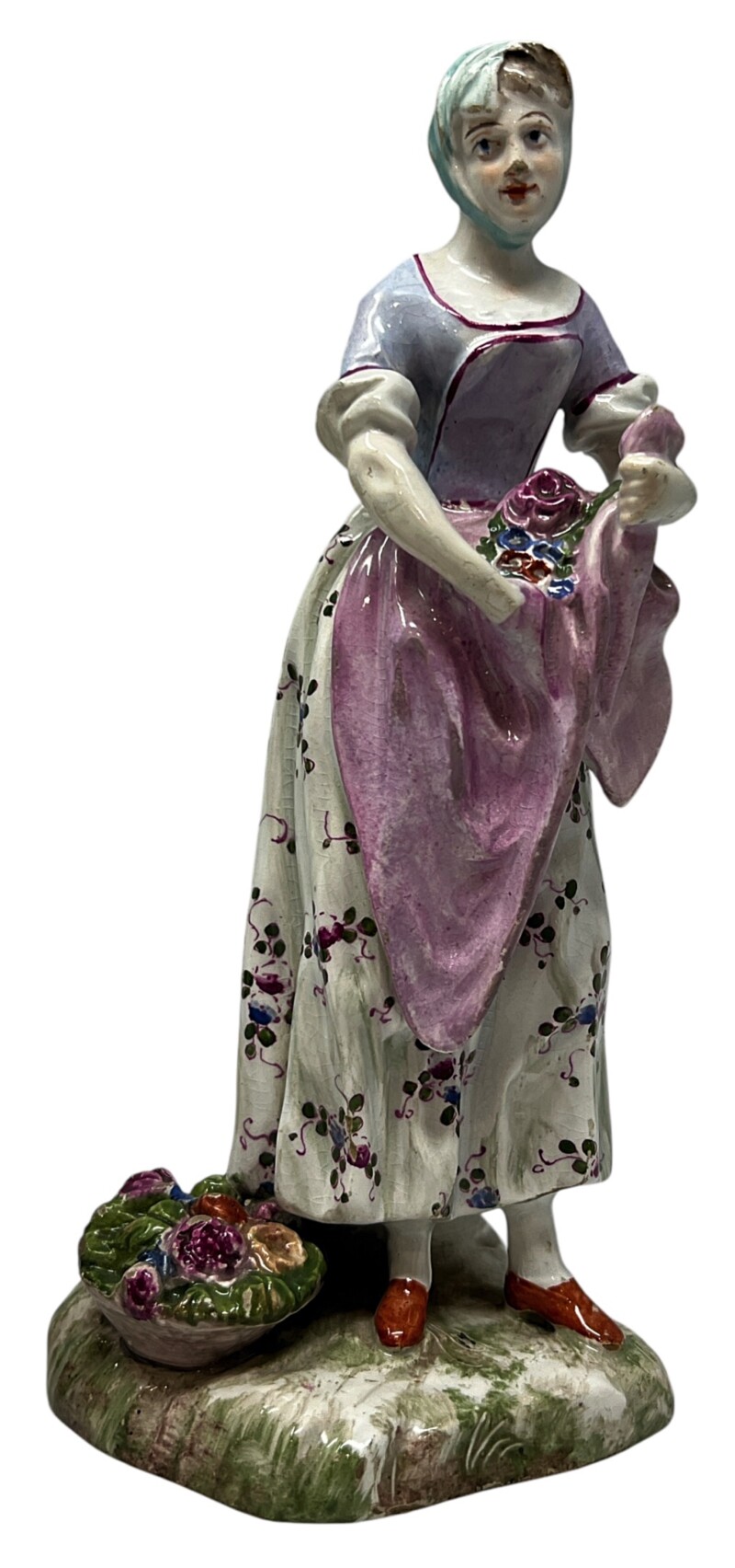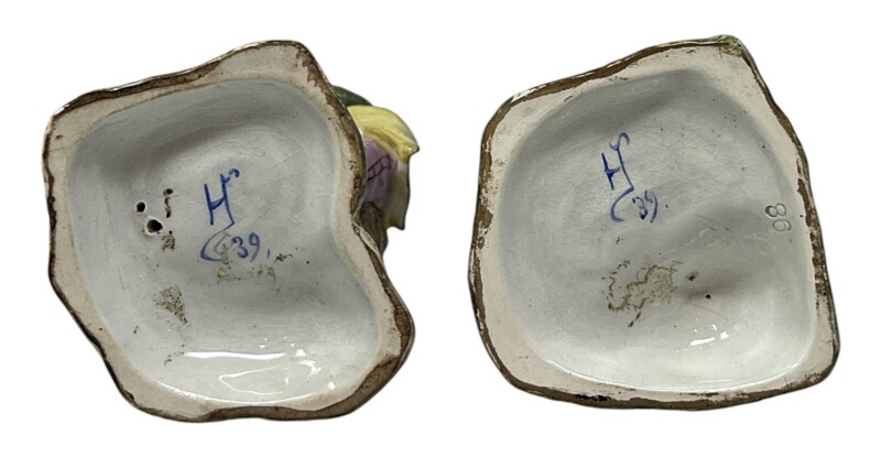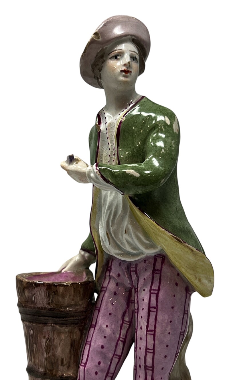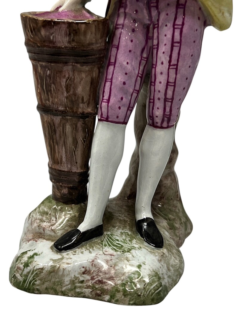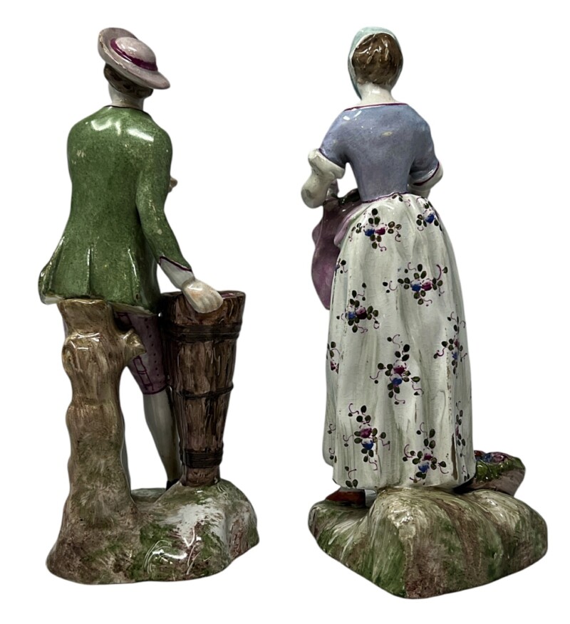 Figurines, PorcelainsThis impressive faience figural pair was created in the late eighteenth century in Strasbourg France at the pottery factory run by Joseph Hannong. Hallmarked on the underside with the Strasbourg factory mark ( H over the number “39” painted in blue). Large square bases like this were typical for the factory.
