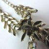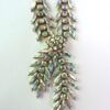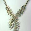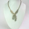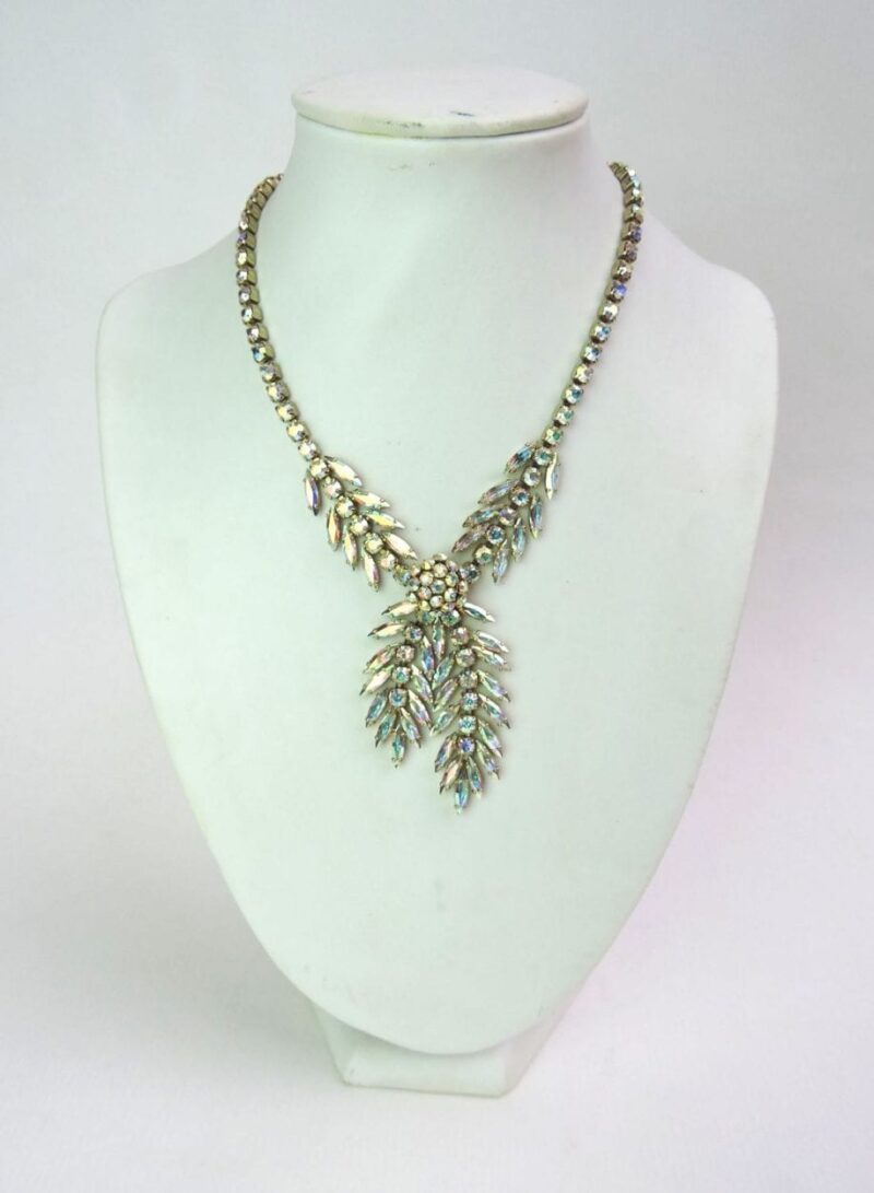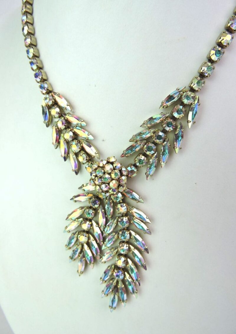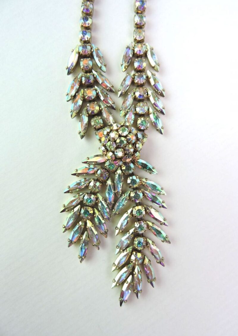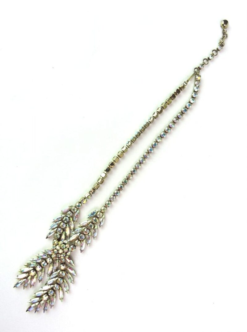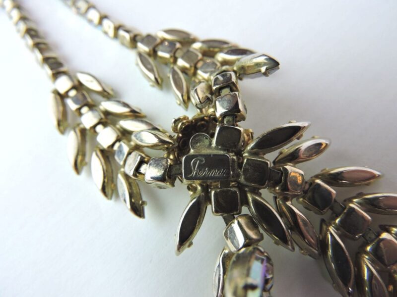 v** SOLD ARCHIVES **vA wonderful 1950s vintage prong-set aurora borealis Austrian crystals necklace, signed “Sherman” in script on the back of the necklace. It is in a gold plated setting (which shows some age wear on the backing) but the stones are brilliantly shiny and are a combination of 2 different sizes of round shapes and baguette shapes. The bottom half of the necklace dangles beautifully – a very artistic looking piece that would enhance any neck.
