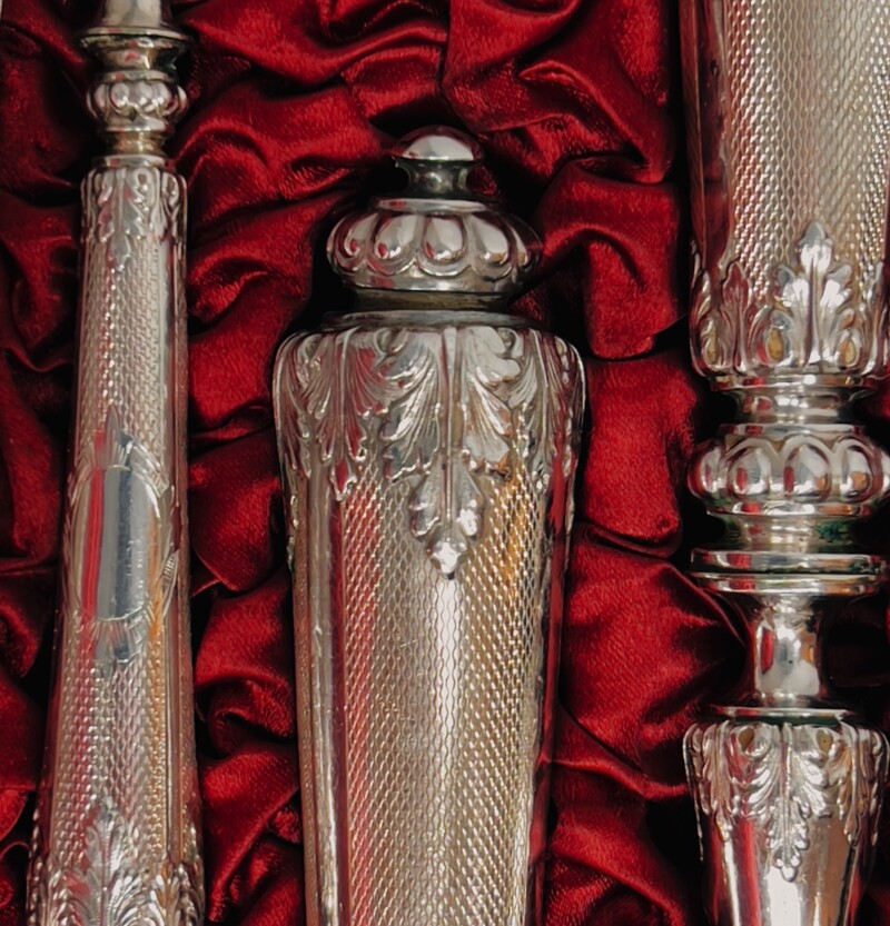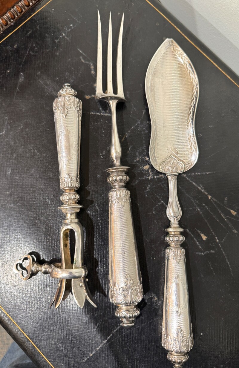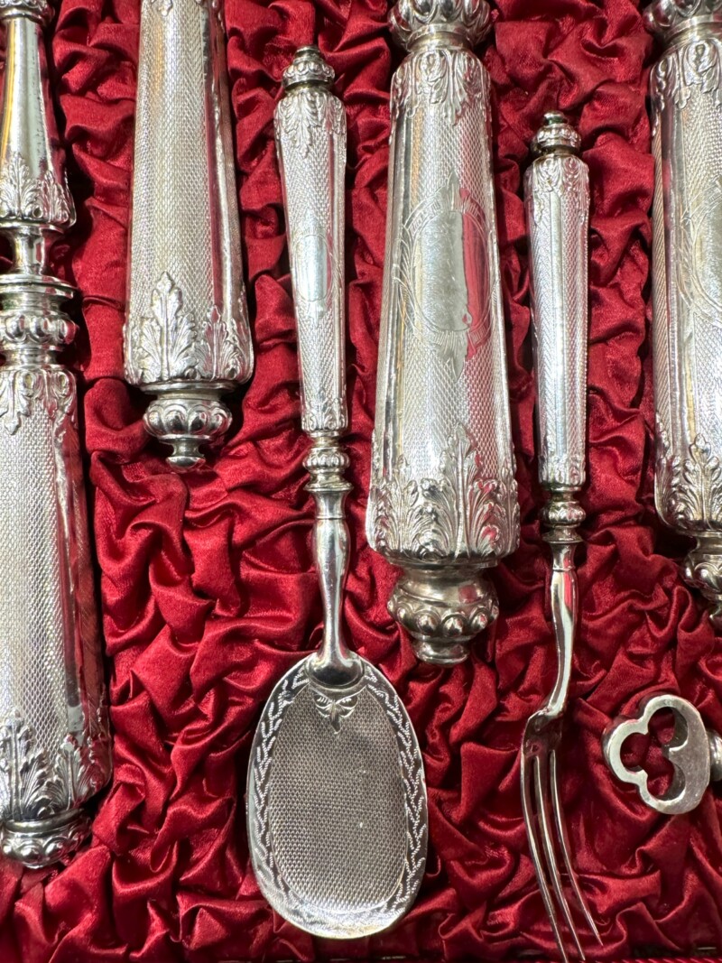 Each handle marked with French “Head of Minerva” silver mark which dates the set between 1838 and 1878 with a Silver fineness of .950 out of 1000 plus maker’s marks.