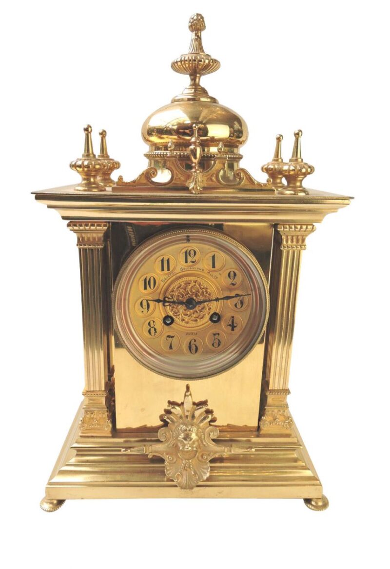A handsome brass French clock retailed through Bristol Goldsmiths Alliance from Bristol, England circa 1885.