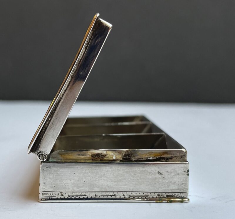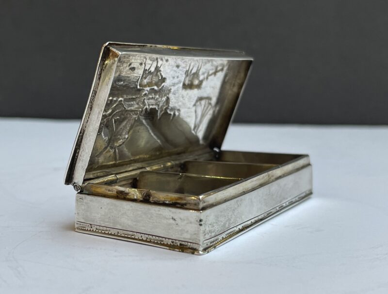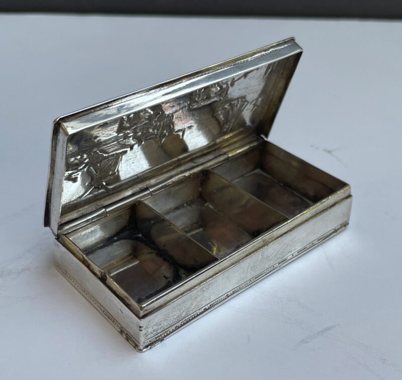 19th Century Dutch Hinged Silver Stamp Box with Dutch Scene Lid.