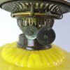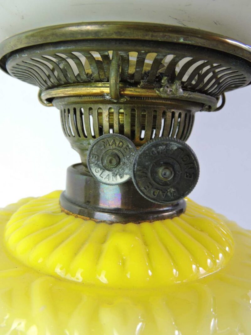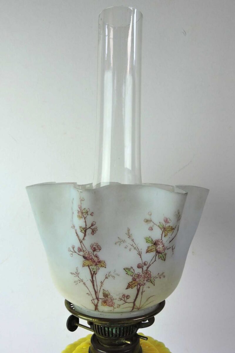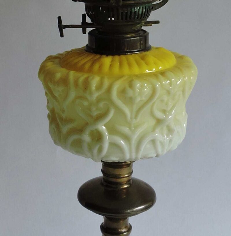 A delightful banquet lamp with brass base, glass shade, and body, it dates 19th Century, England. It has one clear glass shape, and a second glass shade in ivory colour with a floral and leaf design. The base is brass in a solid working condition for easy use and placement. The centre is a unique composition of glass in yellow colour with a scroll pattern, it would have been used for storing kerosene for the flat wick.