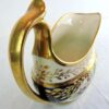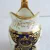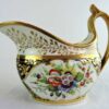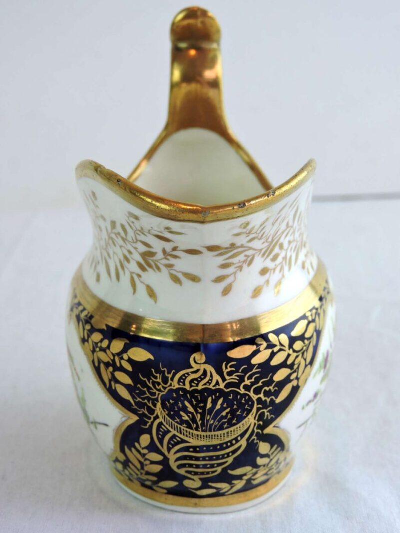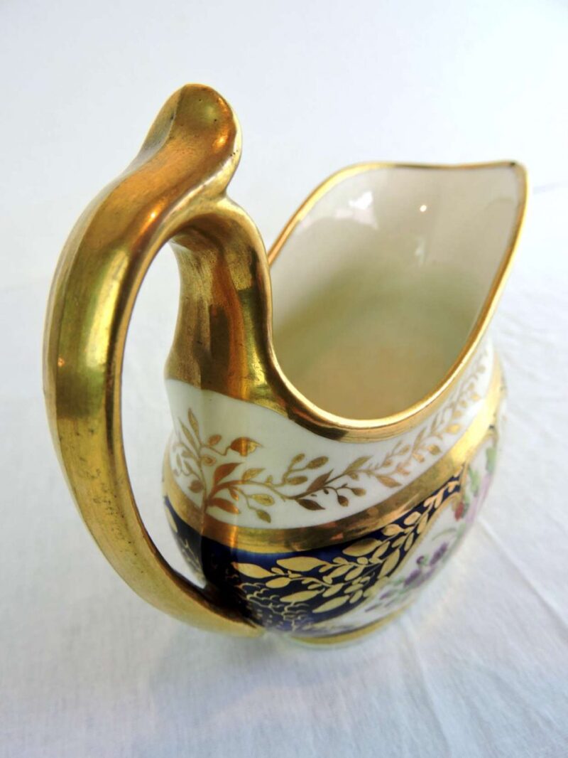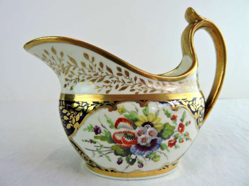 A lovely English creamer with a beautiful hand painted scene, it dates back to the early 19th century. The hand painted scene is decorated with accents and borders of gold leaf, scrolls and floral. The body is uniquely considered with deep blue borders and gold, it directs the viewer to the centre with a stunning scene of wild flowers and roses on white porcelain. The handle is another gold feature, that has a splendid design that gives it character with a vine shape and a budding leaf.