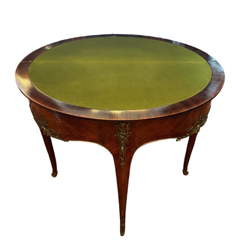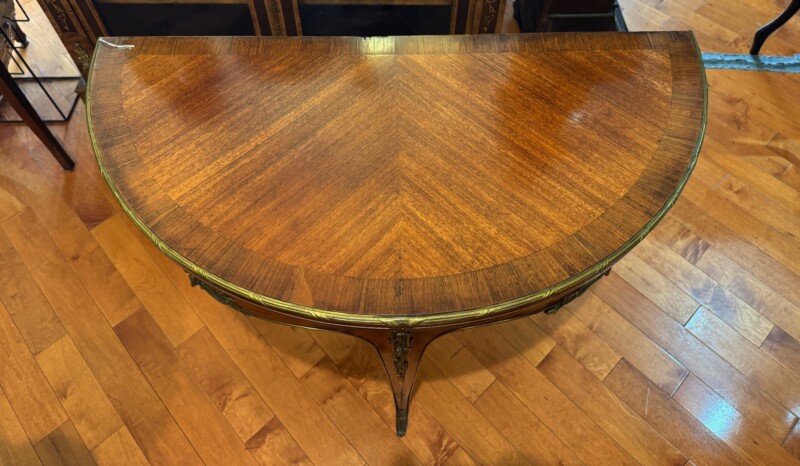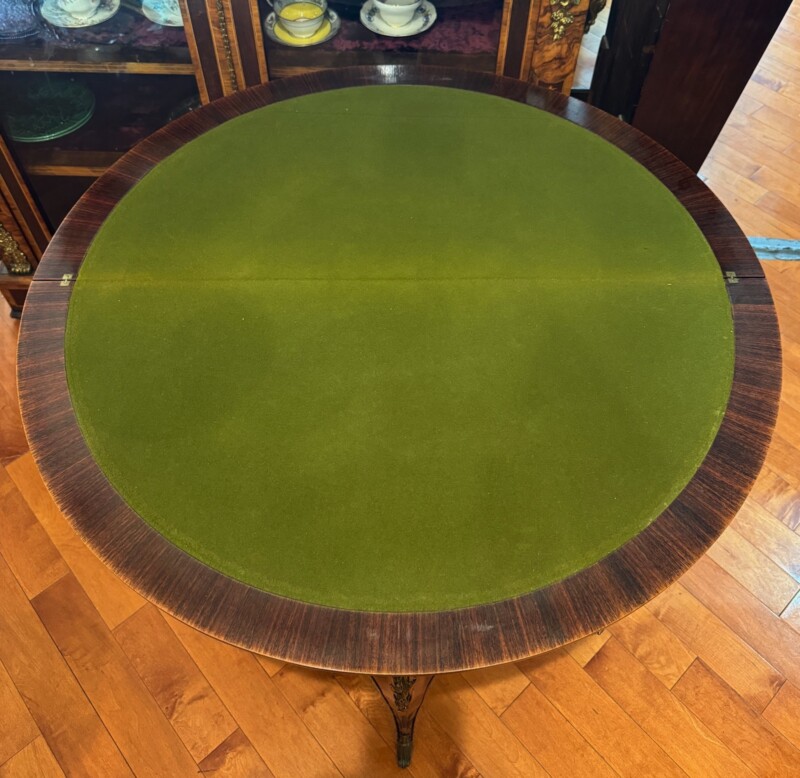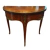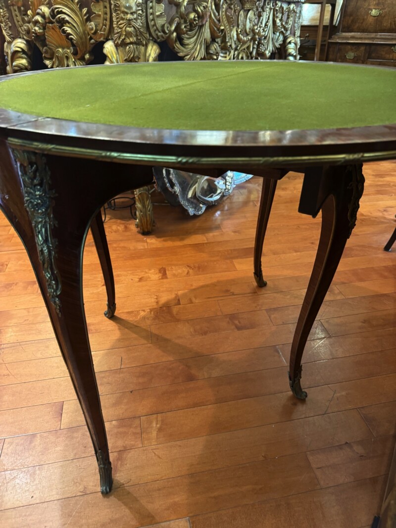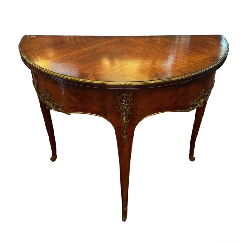An exceptional French demi-lune games table in Kingwood with gilt bronze mounts and trim.  The tables’ back drawer opens to support the other half of the table when opened revealing a green felt top – perfect for playing card games.  The bronze work is high quality and the interior wood is oak.