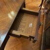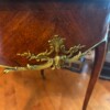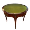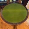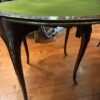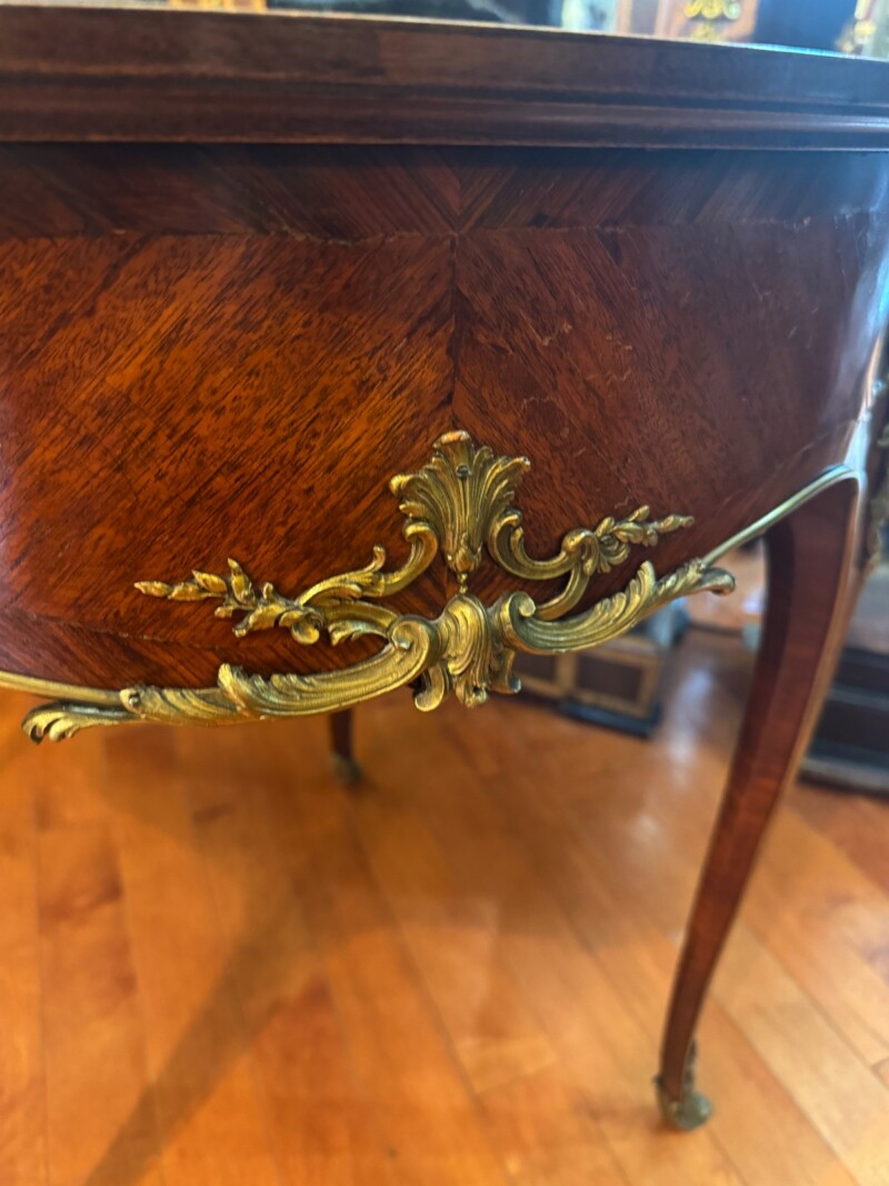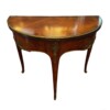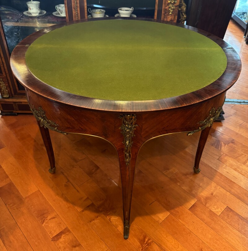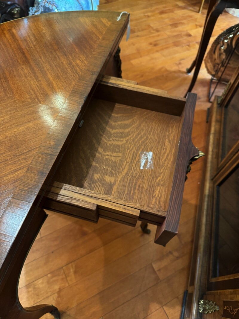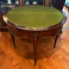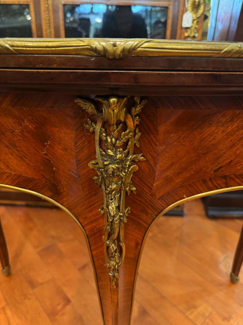 An exceptional French demi-lune games table in Kingwood with gilt bronze mounts and trim.  The tables’ back drawer opens to support the other half of the table when opened revealing a green felt top – perfect for playing card games.  The bronze work is high quality and the interior wood is oak.