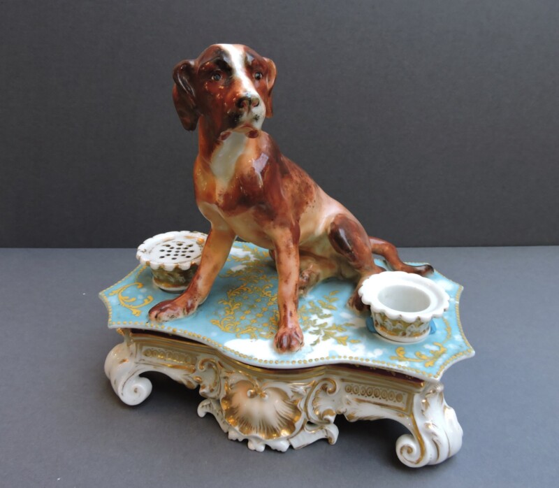 PorcelainsA 19th century French porcelain inkwell with the figure of a brown and white hound dog on the top.