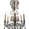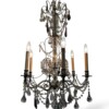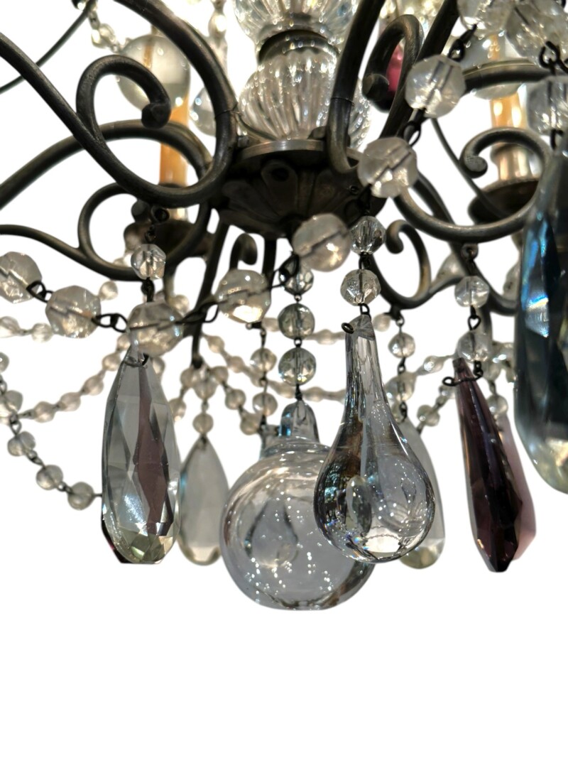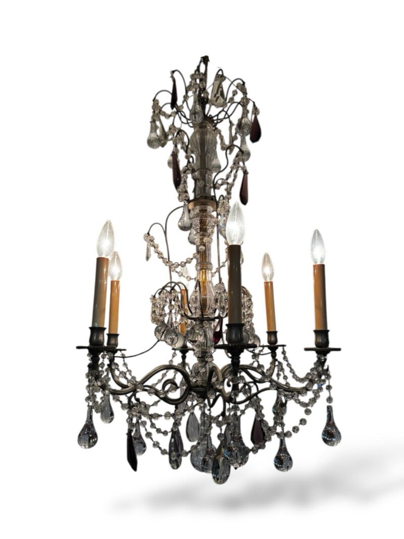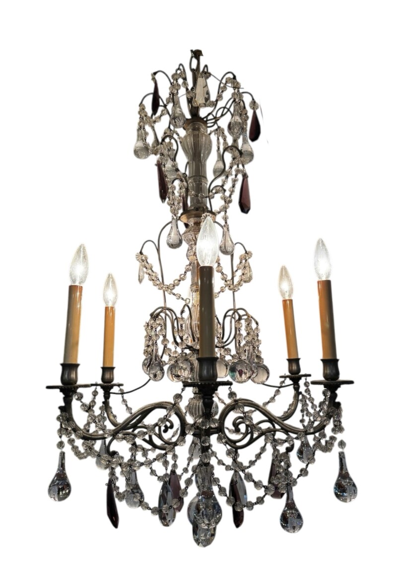 19th Century French Pewter Finish 6 Light Candelabra Chandelier with Hanging Prisms & Teardrops.