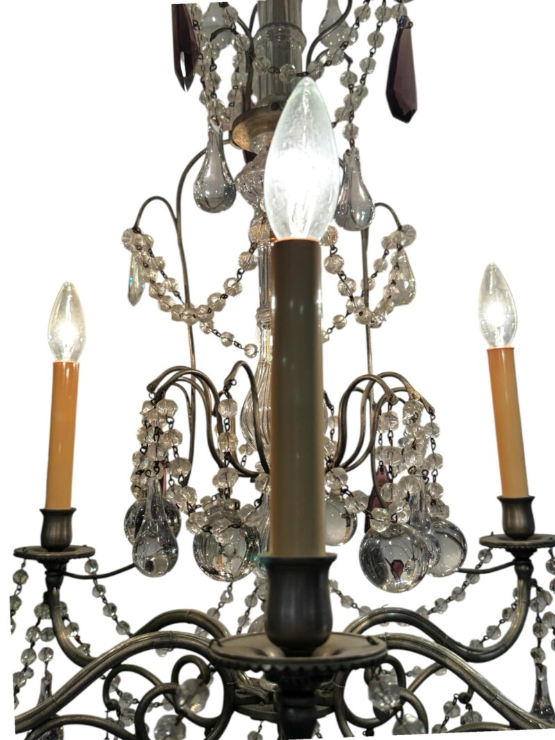 A charming French 8-arm chandelier adorned with intricate cut crystal prisms and striking amethyst crystal teardrops. This electrified candelabra-style fixture features a pewter finish and elegantly tall candle-style lights.