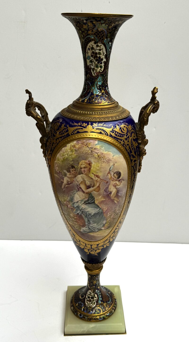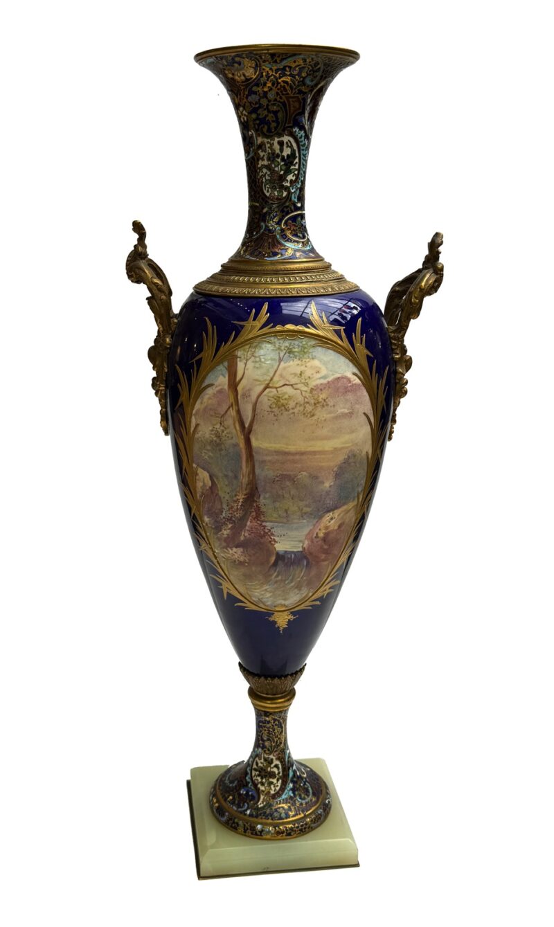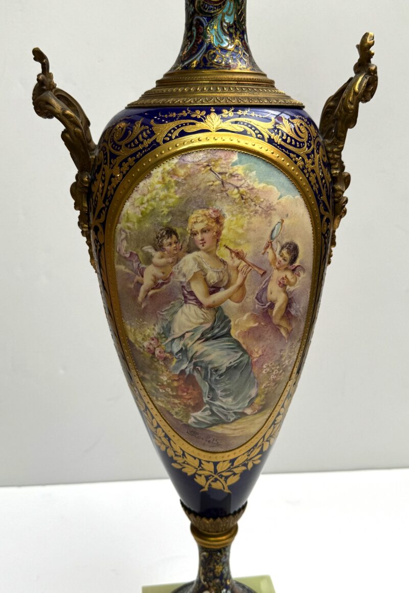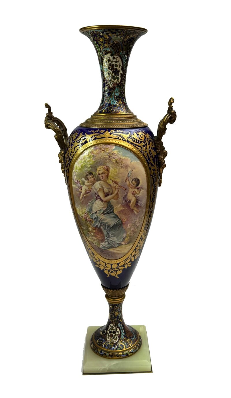 A beautiful French Sevrés porcelain vase with hand painted oval of a woman playing a flute with winged cherubs flying around her.  The scene is signed “Rochette”.  The back is a hand painted oval landscape.  The body in cobalt blue with bronze hardware and a champleve enamelled trumpet neck and foot with a green onyx square base.