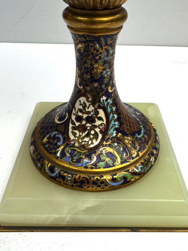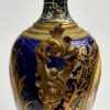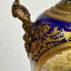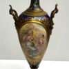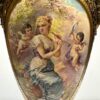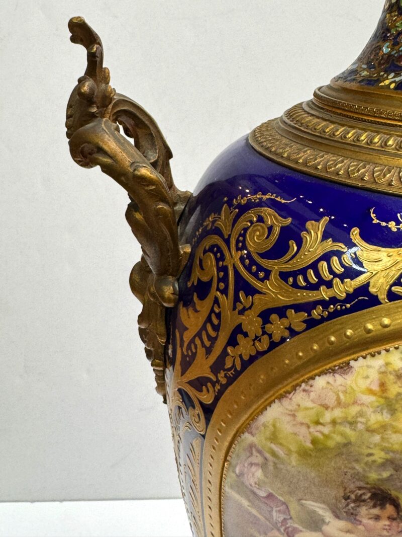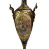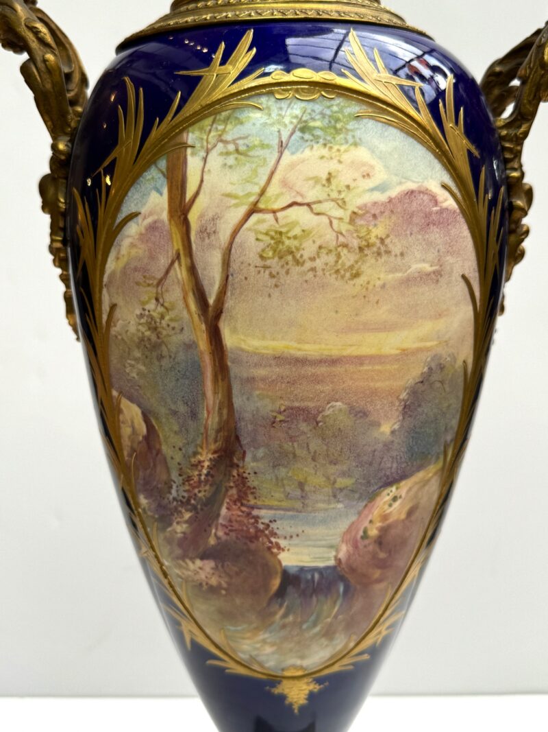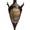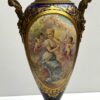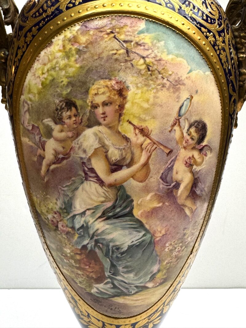A beautiful French Sevrés porcelain vase with hand painted oval of a woman playing a flute with winged cherubs flying around her.  The scene is signed “Rochette”.  The back is a hand painted oval landscape.  The body in cobalt blue with bronze hardware and a champleve enamelled trumpet neck and foot with a green onyx square base.