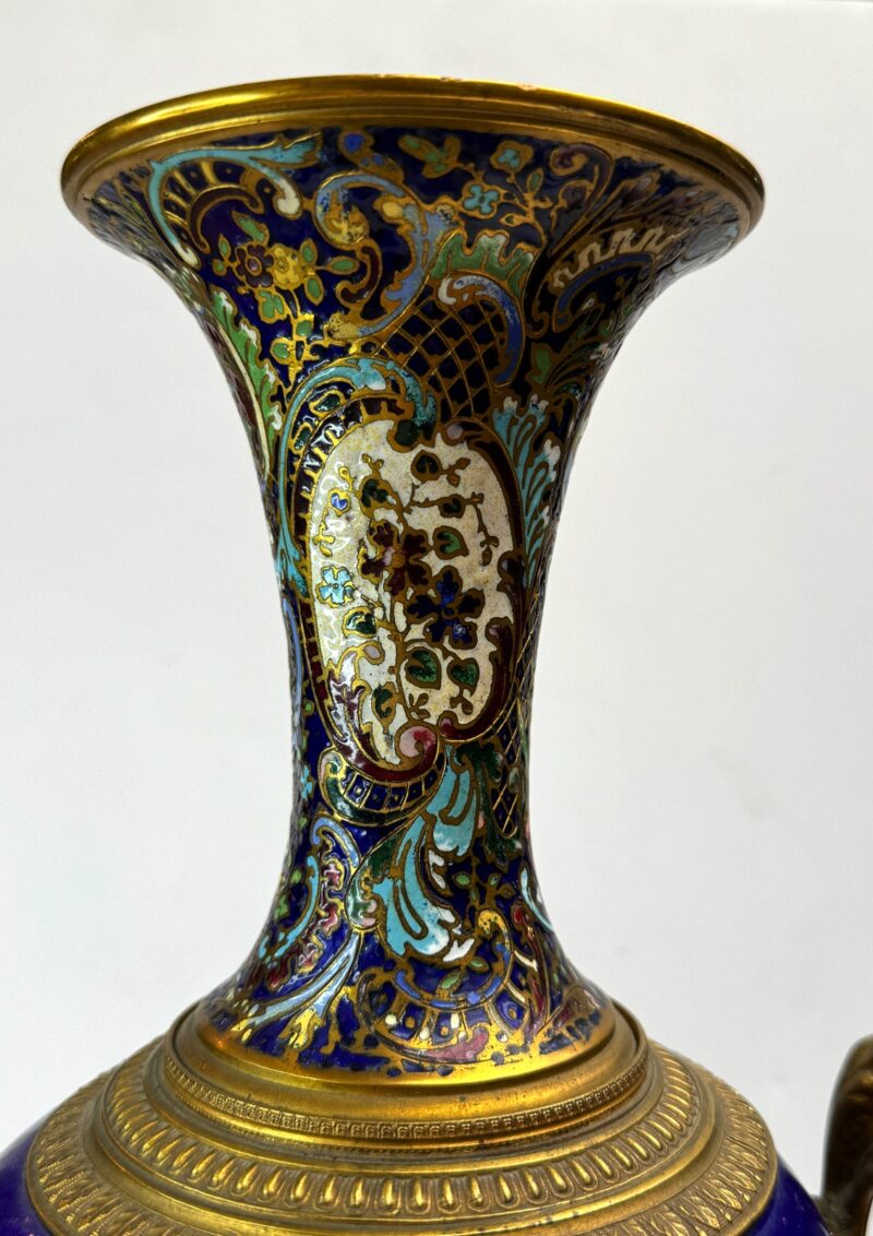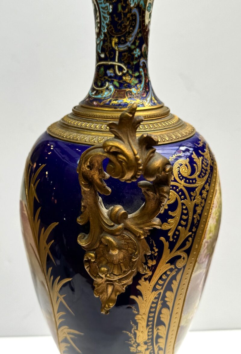 19th Century French Sevres Porcelain Two Handled Vase with Champleve Enamel Neck & Base. Signed “Rochette”