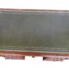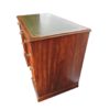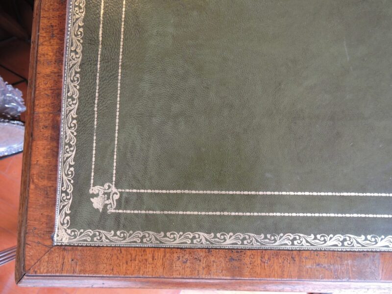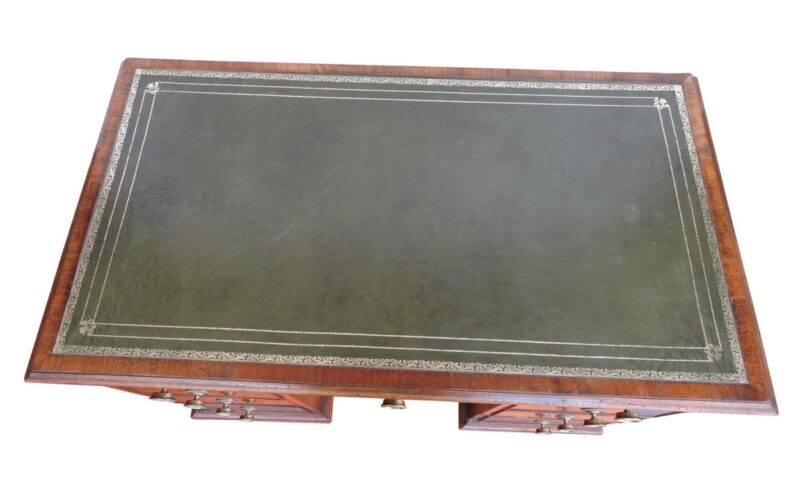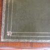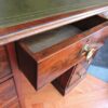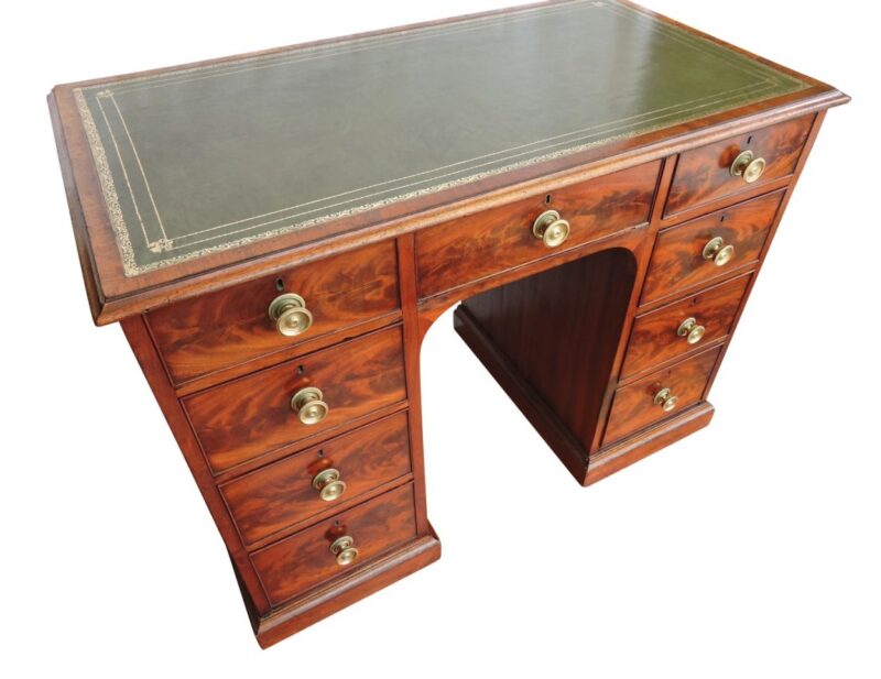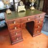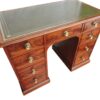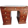 A beautiful small mahogany 9-drawer wooden desk with a green tooled leather top. There is one centre drawer and 4 drawers on each side. Each drawer has a key hole escutcheon and a round decorated brass knob handle.