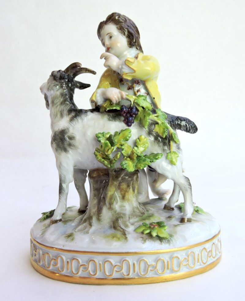 A Meissen porcelain figure group of a boy (gatherer) and goat – dating late 19th century after a model by Johann Carl Schönheit.  He is standing in a yellow jacket holding a grape vine to the back of the goat.  Stands on an oval base with gilt decoration.