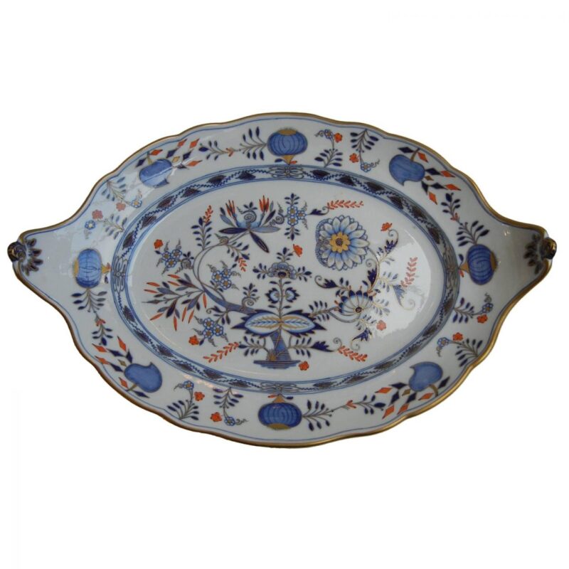 This beautiful Meissen platter is also hand decorated in gold and rust overtop the glaze of the blue onion pattern.  The gold rim is fluted and the shape is very unusual with the two end handles being curved and raised up.