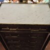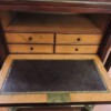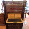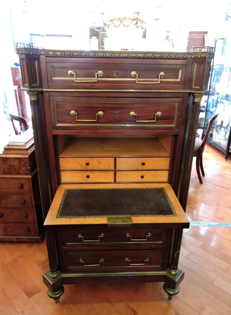 v** SOLD ARCHIVES **vA magnificent quality French Empire style abattant / Secretaire Desk in mahogany that looks like a 7 drawer lingerie chest. 2 drawers are fake and act as the front panel that lowers to reveal a flat desk surface with leather inlay and satinwood cubbies interior. Two reeded pillars flank either side of the chest. The 14 handles all in bronze, with applied bronze borders around each drawer, a bronze upper gallery and bronze mounts all around. A white marble top caps off the top of the piece.