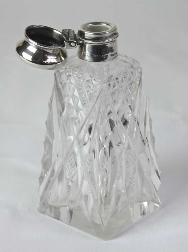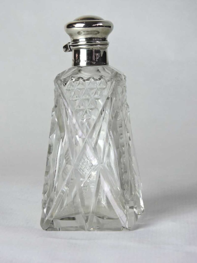 A fine vintage perfume bottle, with sterling hinged lid and clear cut crystal glass with a geometric pattern, it dates 20th century. It features a rectangular shaped bottle in clear cut crystal, and a modern styled lid in sterling. It is beautifully crafted and designed, perfect forĀ a unique gift, or for nostalgic collectors.