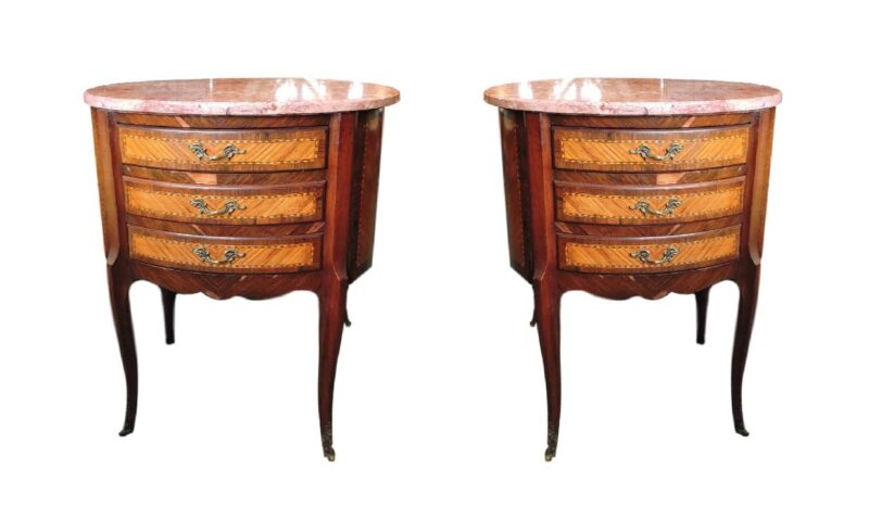 A ’20th Century – Pair of French Marble Top & Inlaid Rosewood And Mahogany Tables’ – made in France, dates around circa 1920.  It features a rosewood and mahogany body with a French inlaid design, a oval-shaped marble top and 3-drawer chest centre.