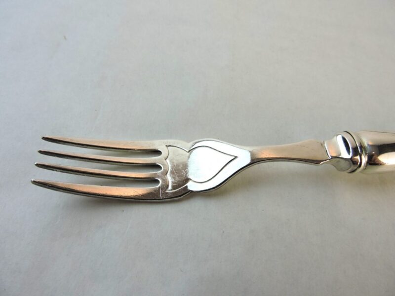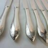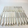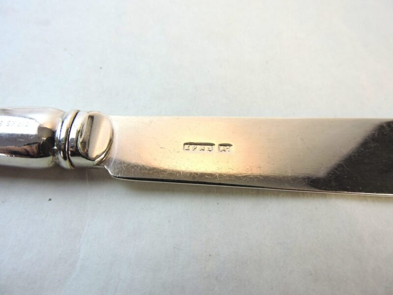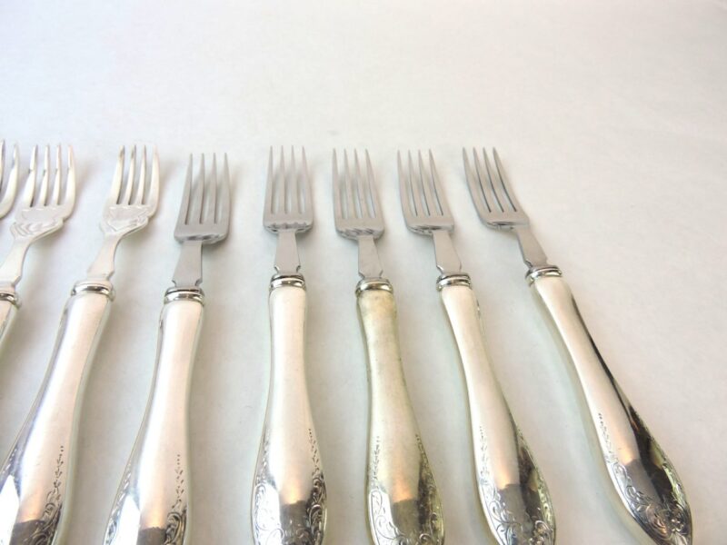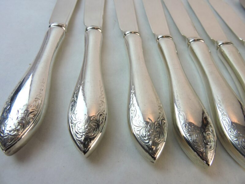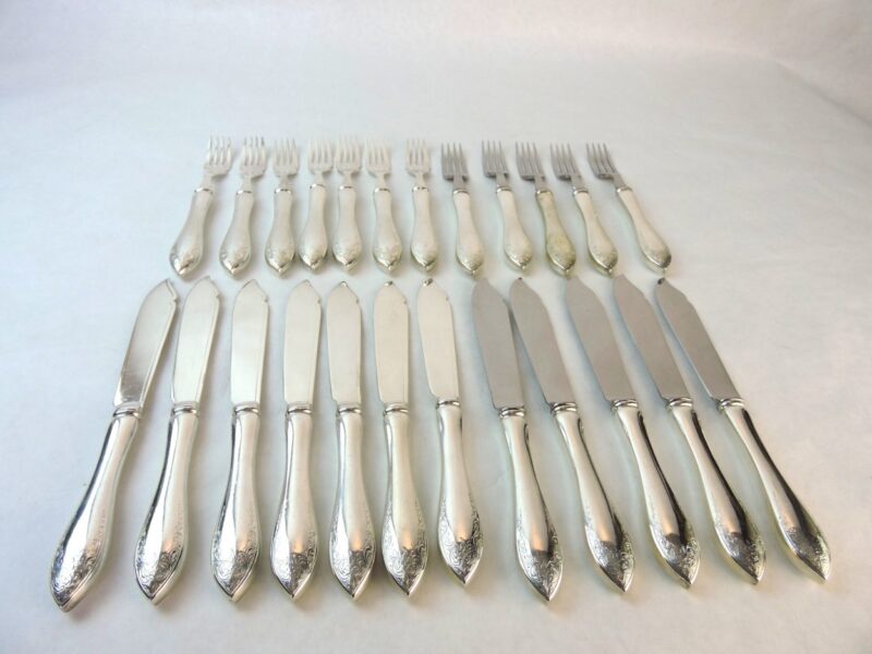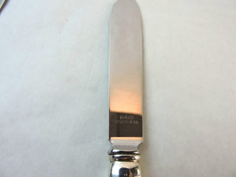 A lovely grouping of 12 each fish knives and forks with the Birks sterling silver “Tudor Scroll” pattern on the fronts of the handles. There are 7 knives and forks marked “EPNS” on the knife blades and 5 knives and forks that read “Birks stainless”. However, all 24 pieces are marked “Birks Sterling” on the inside of the handles.