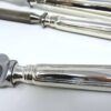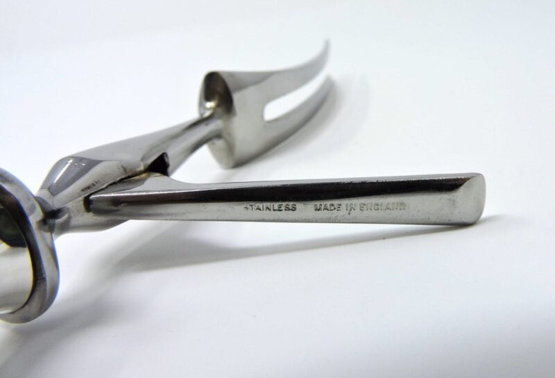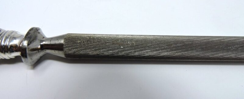 Here is a lovely 3 piece meat carving set by Birks Sterling in the “Saxon Pattern”. The set consists of a carving knife, fork, and sharpener. All have sterling silver handles with stainless blades made in England.  The Saxon pattern is simple and elegant.