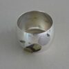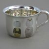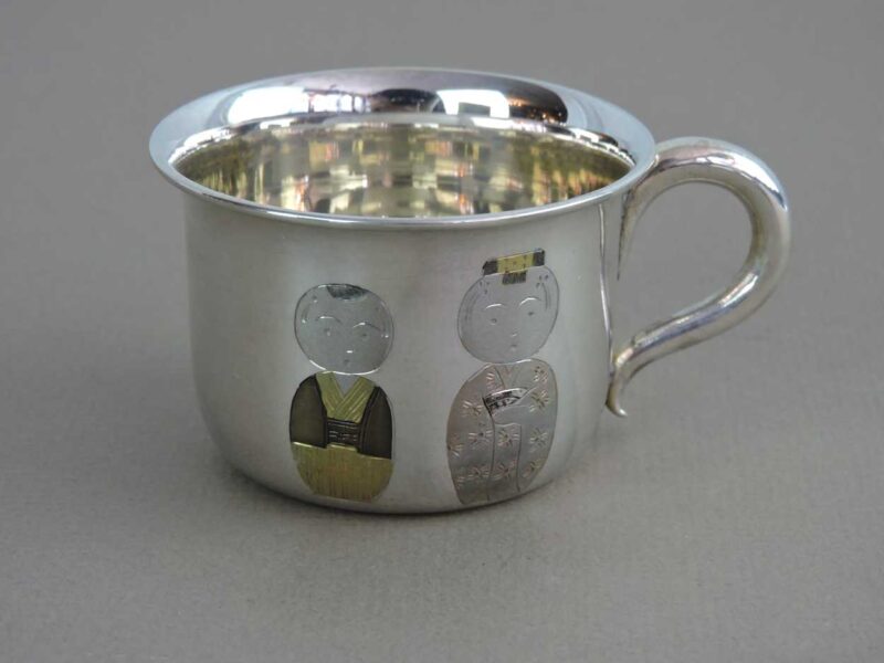 v** SOLD ARCHIVES **vA ‘4 Piece Set – Japanese. 950 Silver Children’s Christening Set ‘ – dates 20th century. It features 1 mug, 1 napkin ring, 1 fork and 1 spoon in matching miniature/children’s size, decorated with a unique pattern, consisting of illustrative figures dressed in traditional Japanese motifs in black and gold. Beautiful set with an additional fitted box.