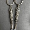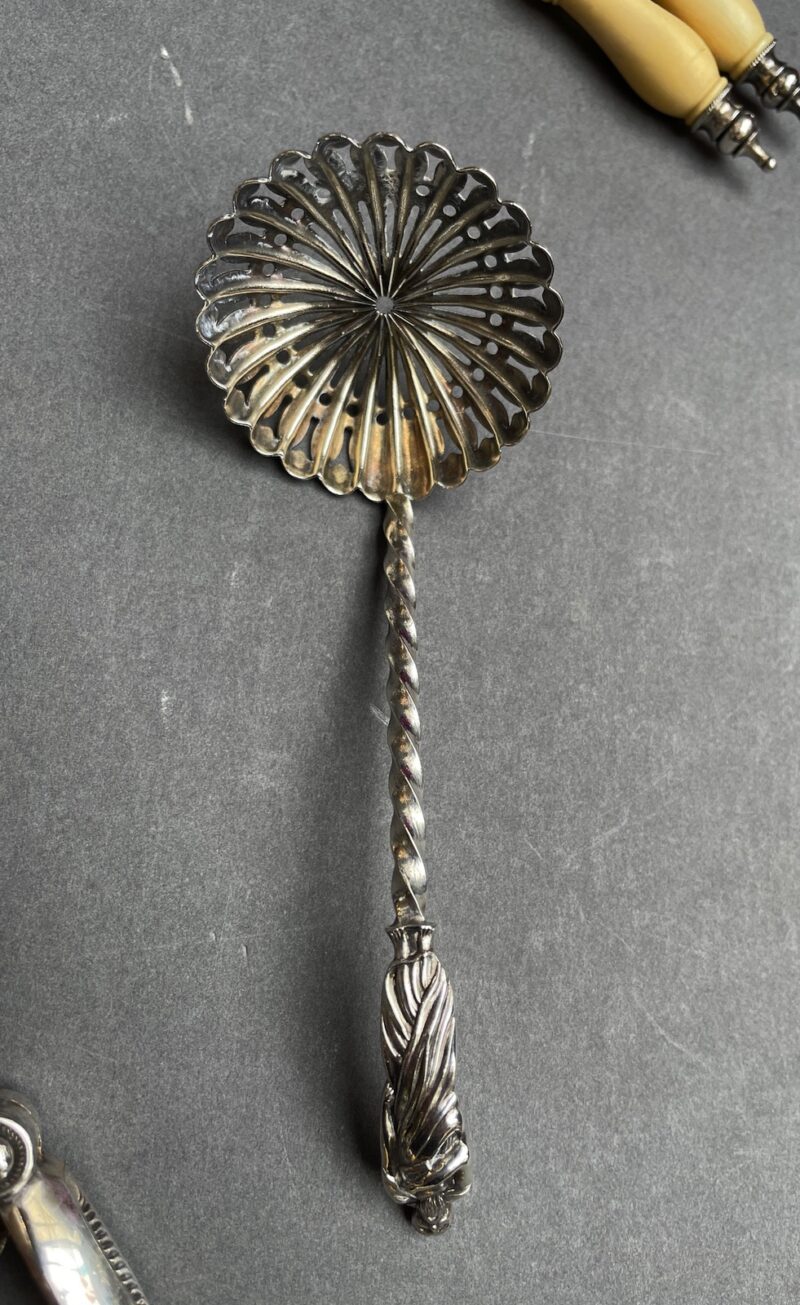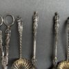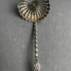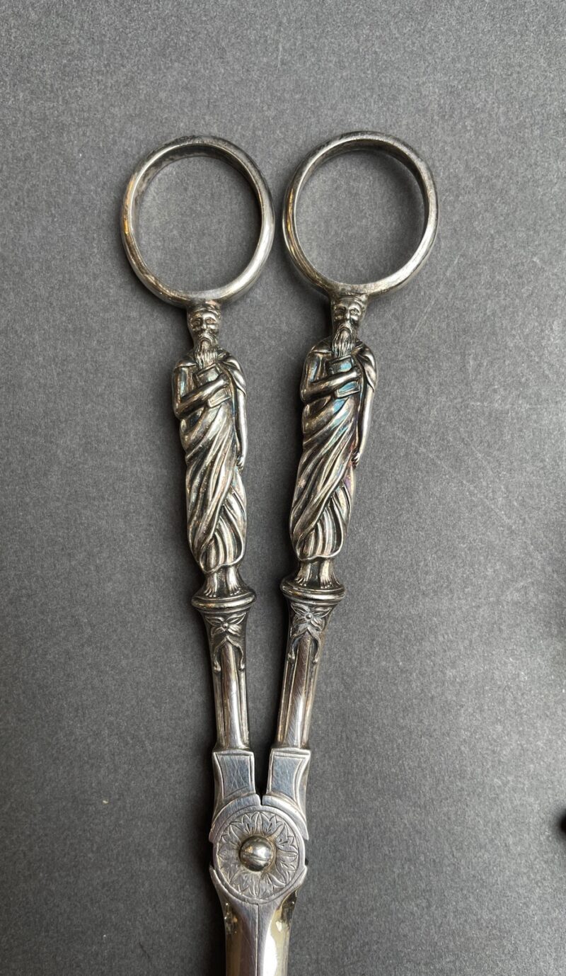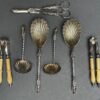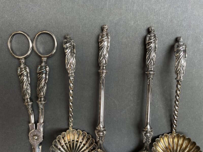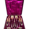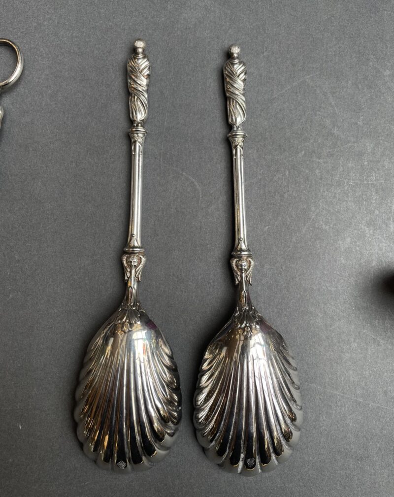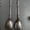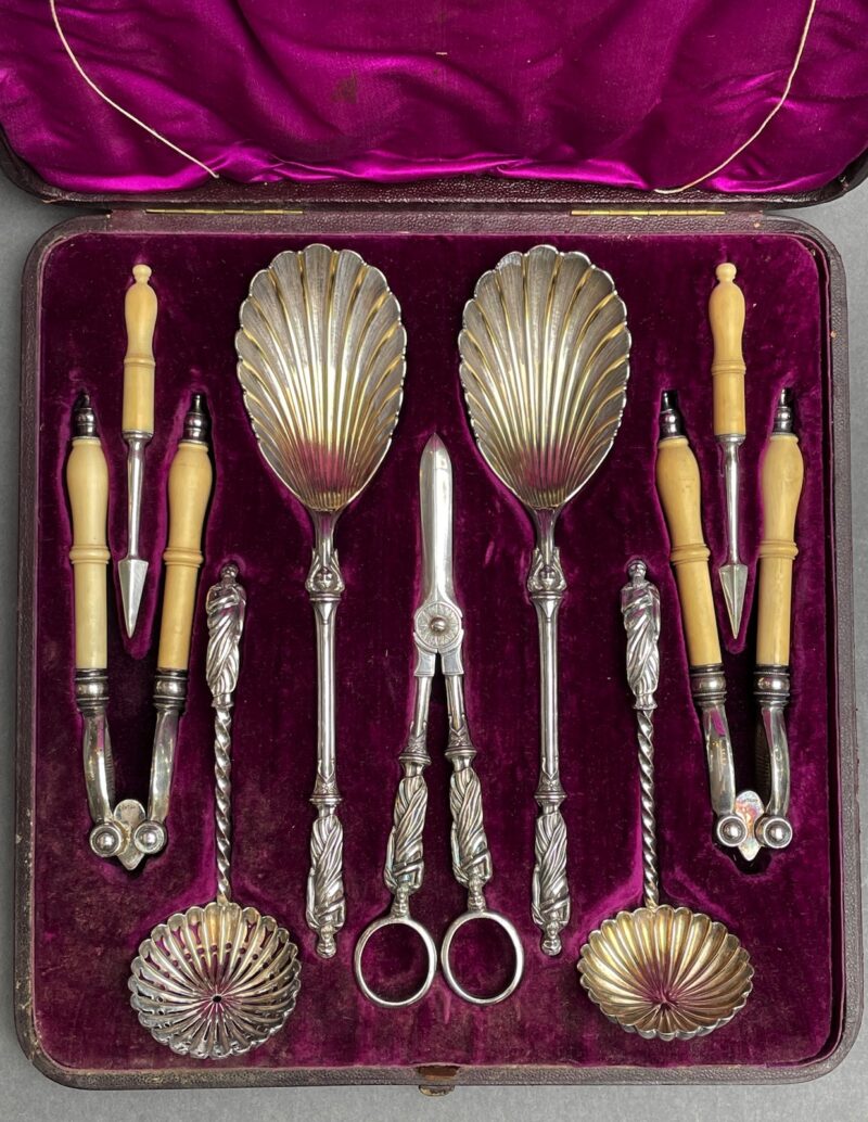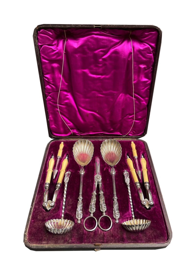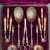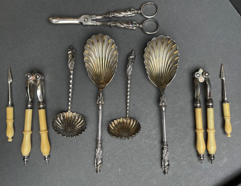 A real gem of a serving set for berries and nuts and fruit.  The set in it’s original fitted leather bound and silk and velvet interior.  The set consists of 2 berry spoons, grape scissors, powdered sugar ladle, sauce ladle, 2 nut picks and 2 nut crackers.  All the handles are figural shaped.