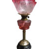 A wonderful cranberry glass banquet lamp with a clear glass globe, brass hardware, and an ebony base. The cranberry glass shade has a floral pattern on it and has a ruffled rim.  The oil well is not patterned. The adjustment knobs are stamped “British Made Duplex”.
