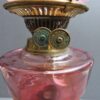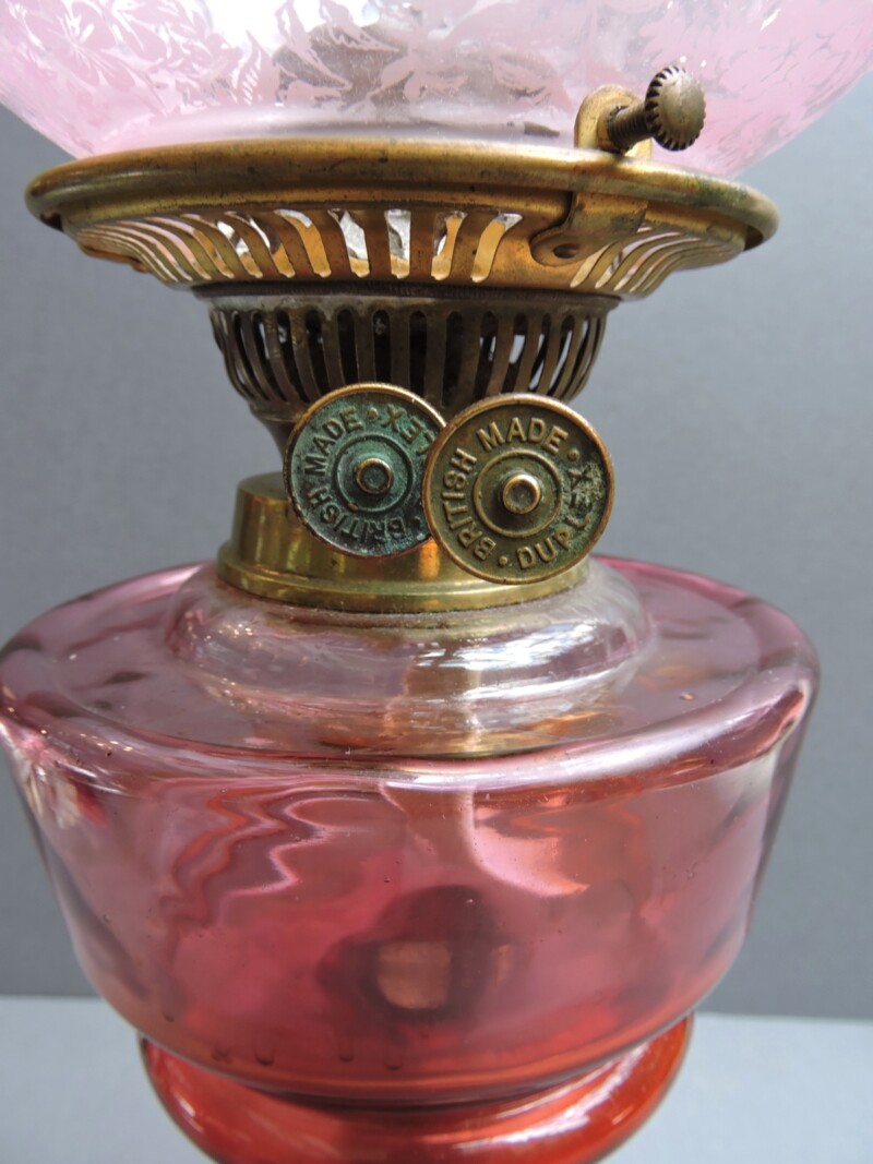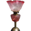 A Beautiful Cranberry Glass Banquet Lamp with Brass Hardware, Clear Glass Globe, “British Made Duplex”