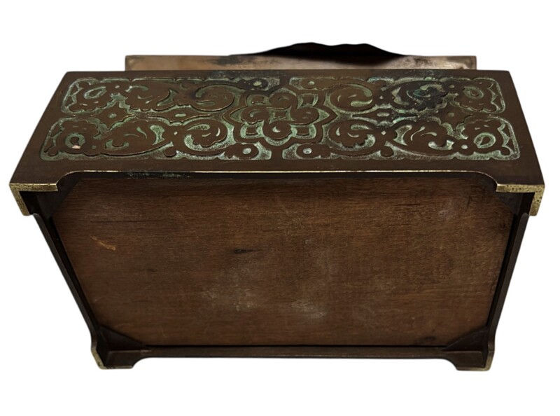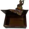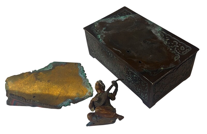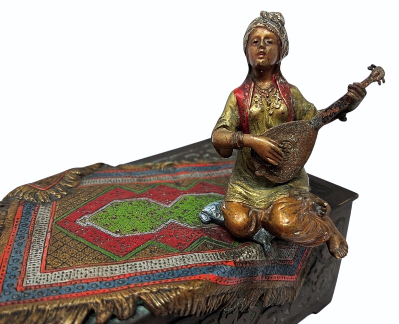 This fabulous box is surmounted by an Arab “woman playing a mandolin”. She seated on the top edge of a painted Persian carpet with one foot extending out. The bronze box sides are decorated in panels of Persian design elements and stamped with the number “31” under the musician and carpet. The box is lined with wood made to hold cigarettes/tobacco. The figure and persian carpet are mostly cadmium shades of red, orange, green and silver, all with a lovely patina hue.