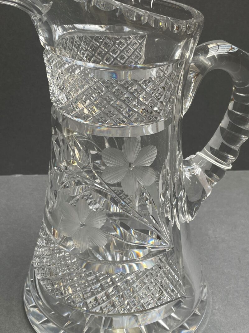 A nice quality, heavy cut crystal water jug with deep wheel cuts with etched flowers, stems and leaves.