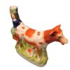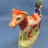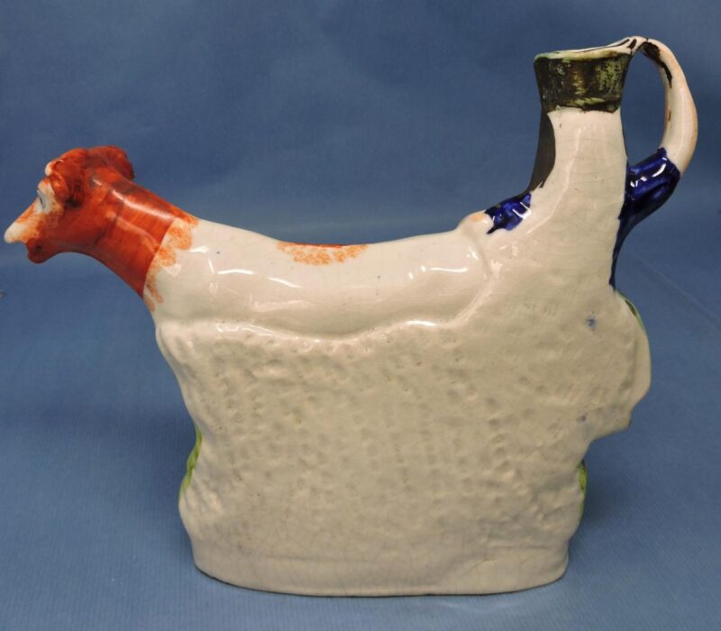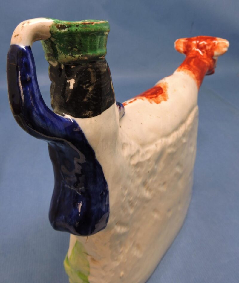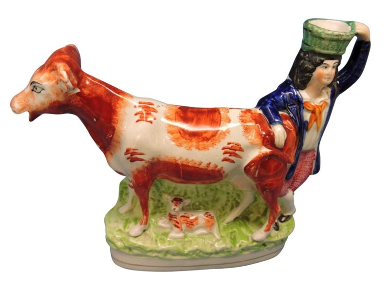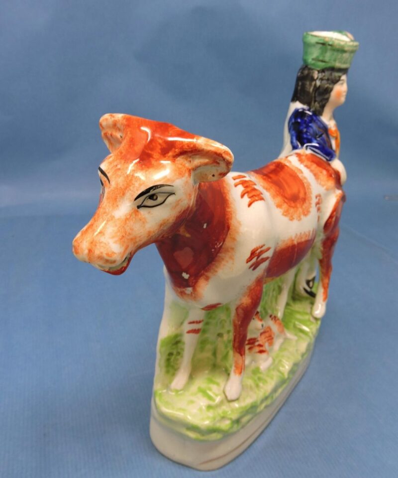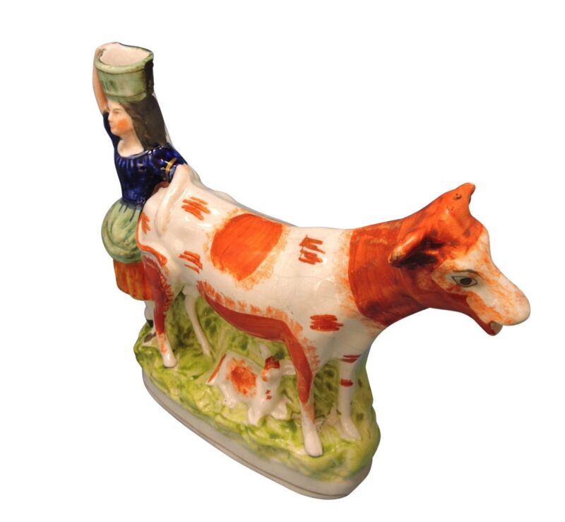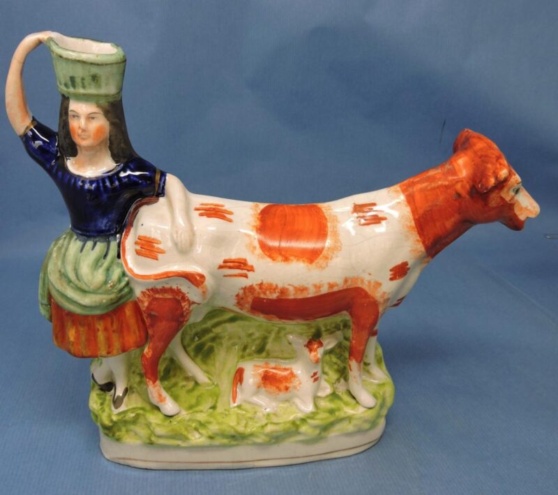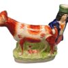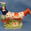 v** SOLD ARCHIVES **vA lovely pair of 19th century Staffordshire English pottery milk jugs with figures and cows. The milk is poured into opening of the basket on the figure’s head and then, when poured, exits by the cow’s mouth. One jug has a woman figure and the other shows a man.