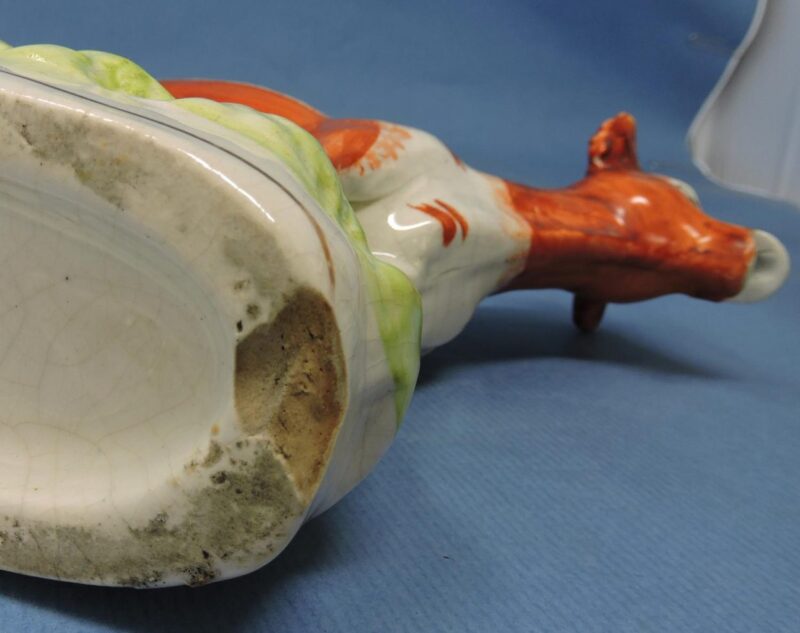 Note: there is age crazing on the woman jug and a crack at her wrist. There is also a chip on the underside of the bottom rim of the piece and on her nose. On the man jug, there is some paint loss on the cow and on the man’s head.