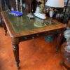 v** SOLD ARCHIVES **vA handsome and large early 19th century leather top desk with 4 solid reeded mahogany legs on brass castors. There are 4 drawers in total – two on each end of the desk. Large enough for two people on either short end or a great large space for one on the long end.