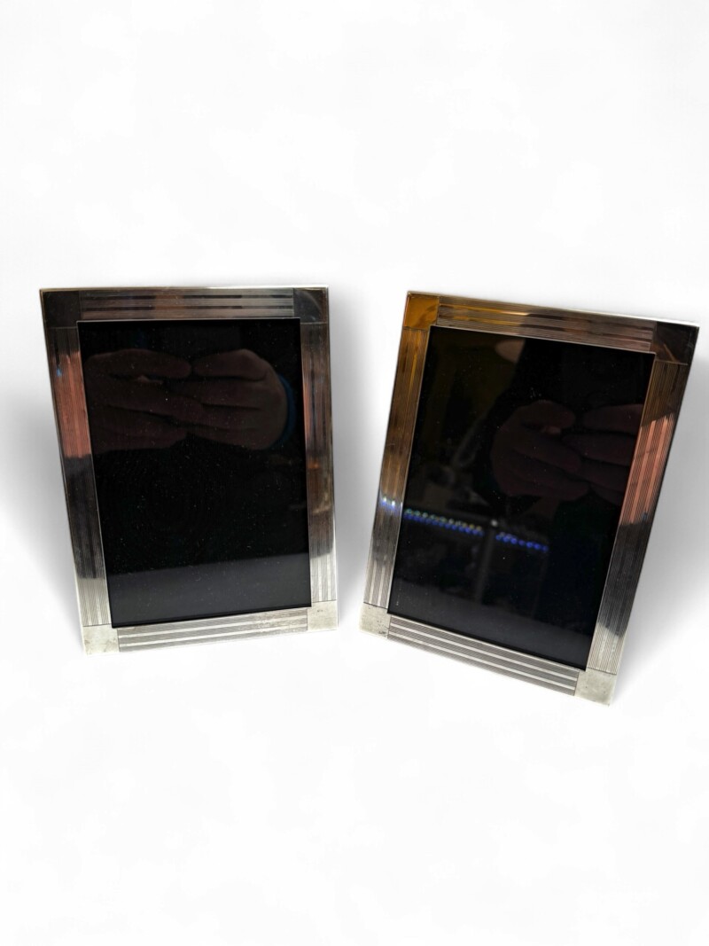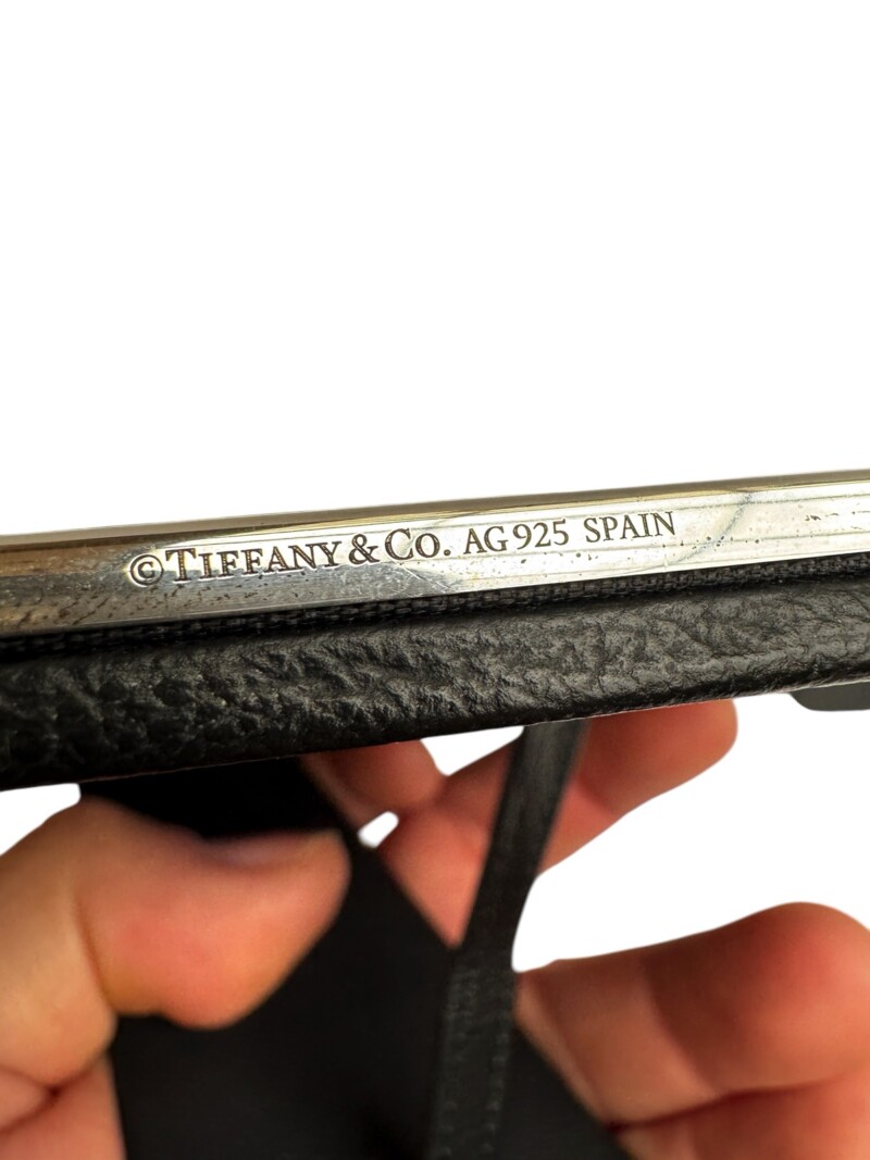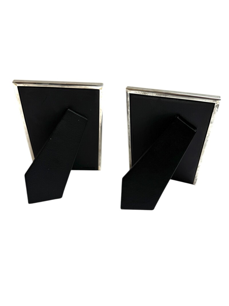 v** SOLD ARCHIVES **vA wonderful pair of 20th century sterling silver rectangular picture or photo frames by the world renowned Tiffany & Company. A classic beautiful “engined turned ” engraving decoration to each front surround. The reverse is tooled black leather and stamped “Tiffany & Co ” with the easel allowing for vertical or horizontal display. In 1851, Tiffany was the first American company to institute the .925 sterling silver world standard and Tiffany is manufactured around the world. Silver marks to the bottom edge on both frames, show these frames were manufactured in Spain “Tiffany & Co. 925 Spain”.